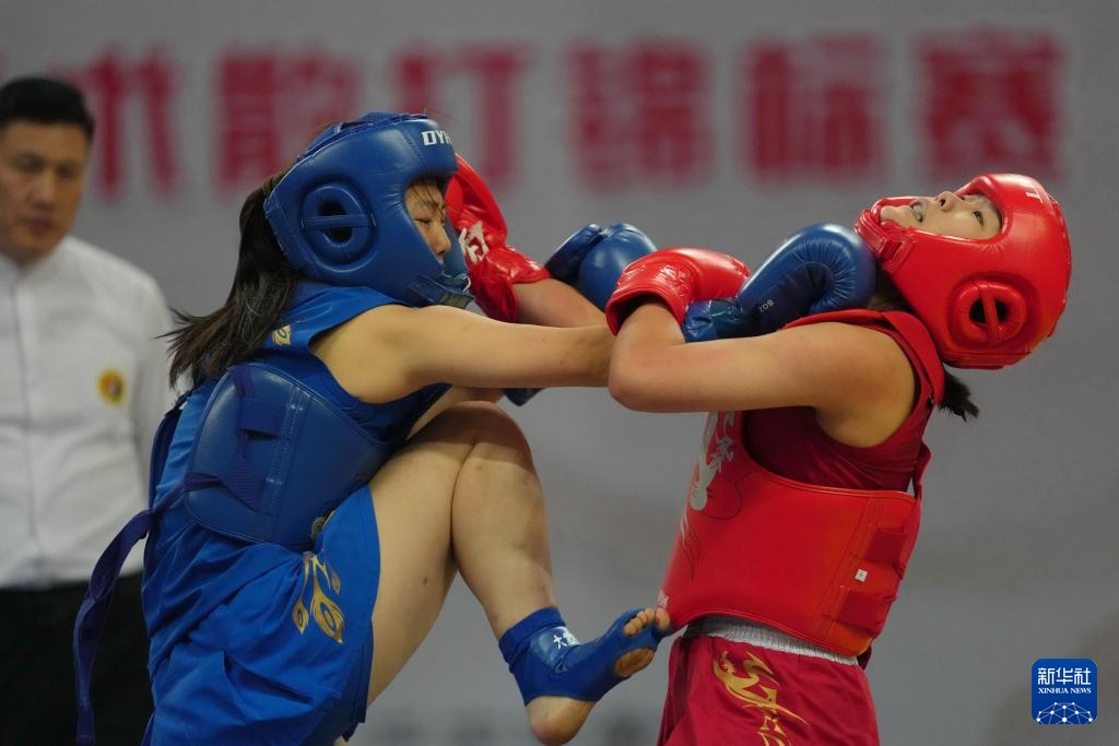 11月3日,辽宁科技大学选手王译浛(左)和马鞍山学院武术散打队选手程雨在女子甲A组47公斤级比赛中。
