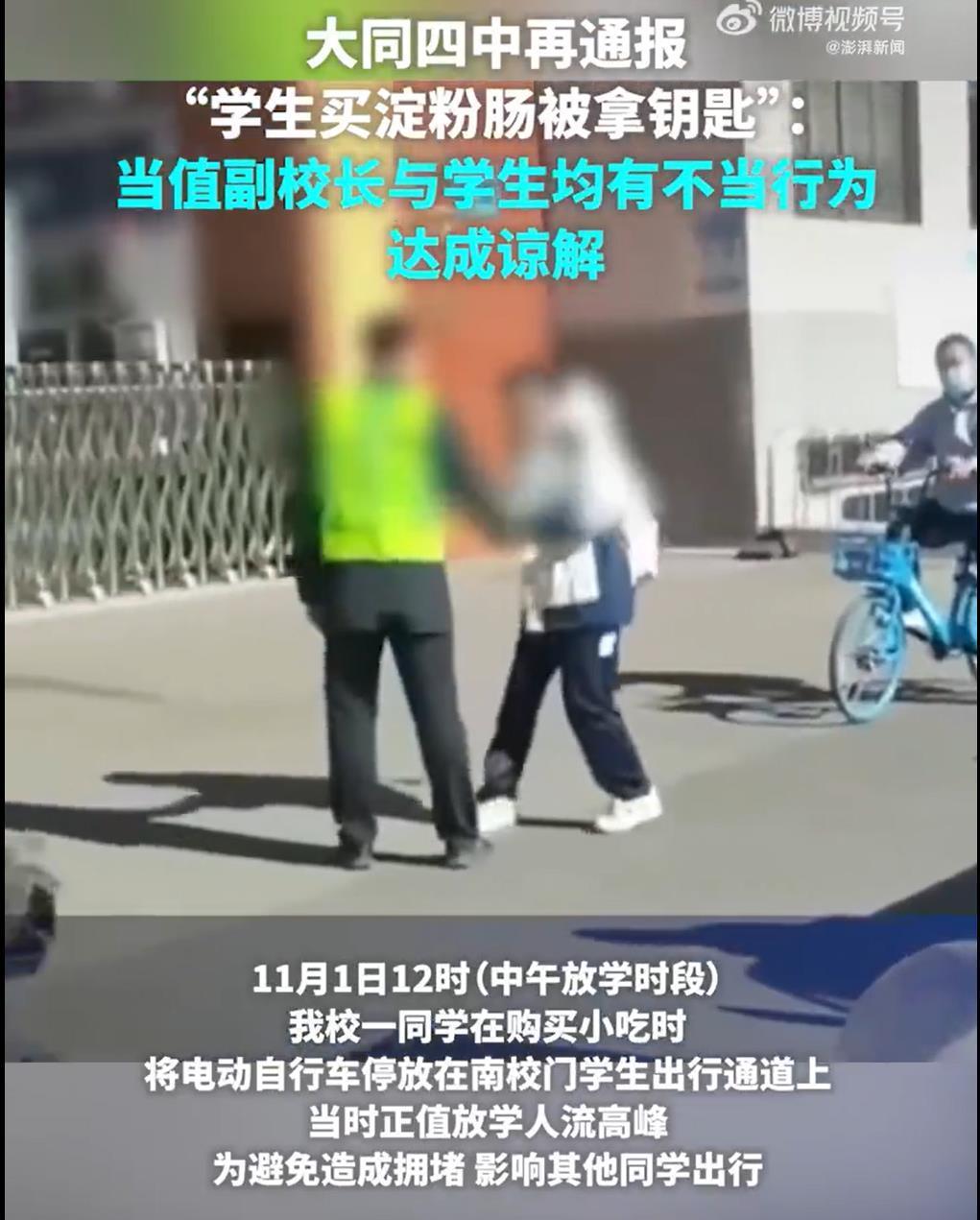 2025年11月1日,山西大同四中一名女生在校门口买淀粉肠时,电动车钥匙和家门钥匙被学校工作人员收走。网传视频显示,女生急得大声哭喊“还给我,你还给我”,而穿绿背心的工作人员走向校内,还称“看我给不给你”。