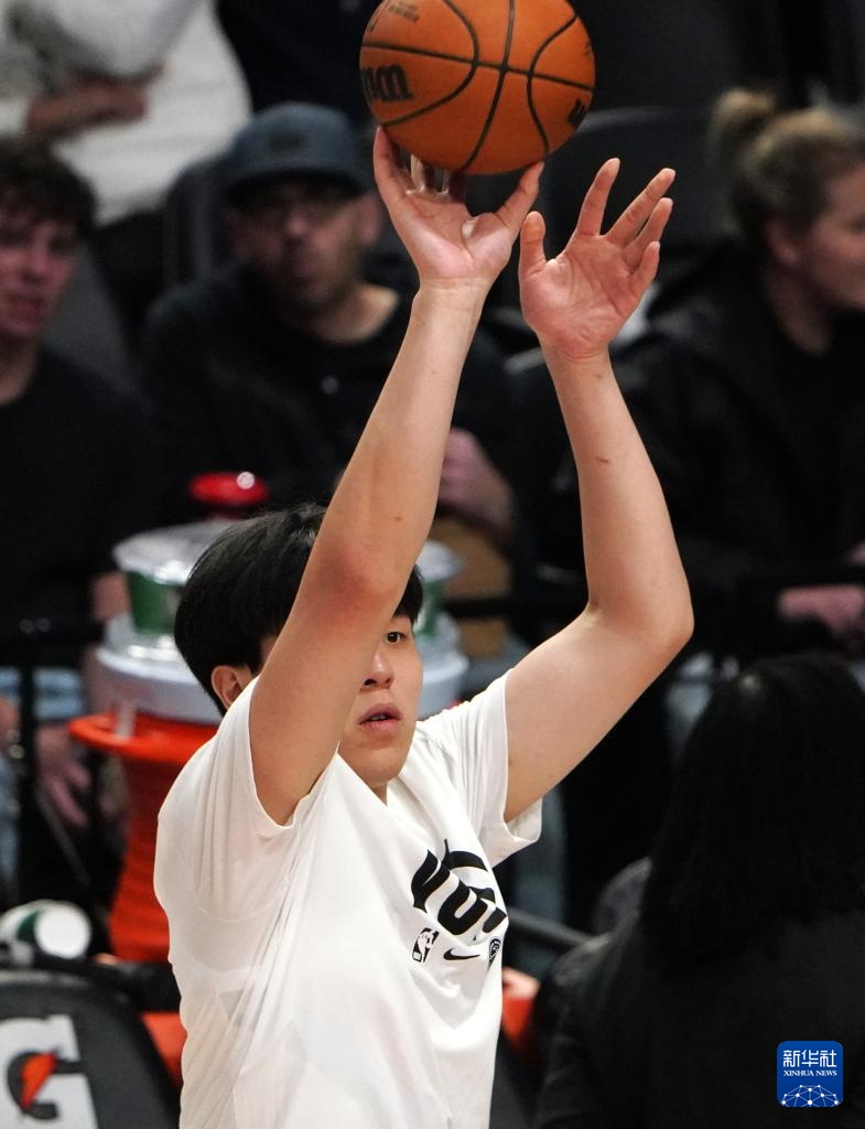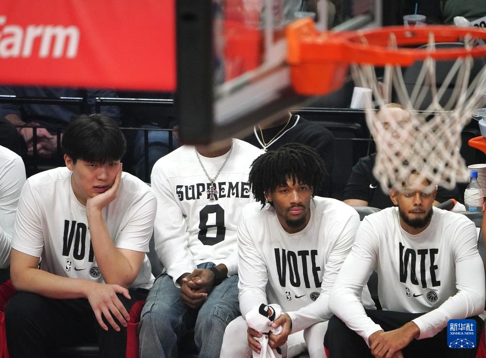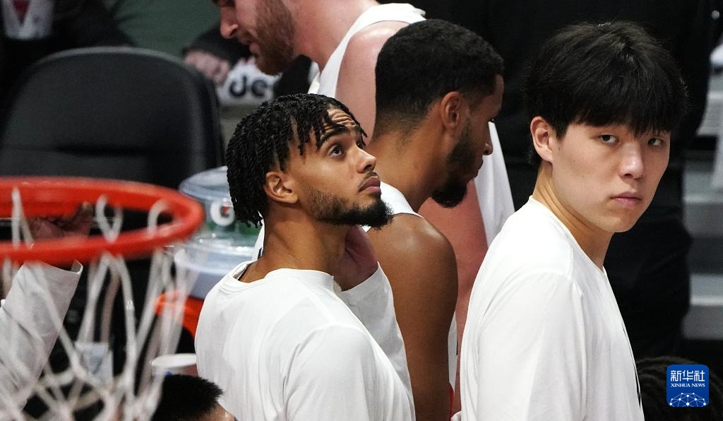 11月3日,杨瀚森(左一)坐在场边替补席上观战。