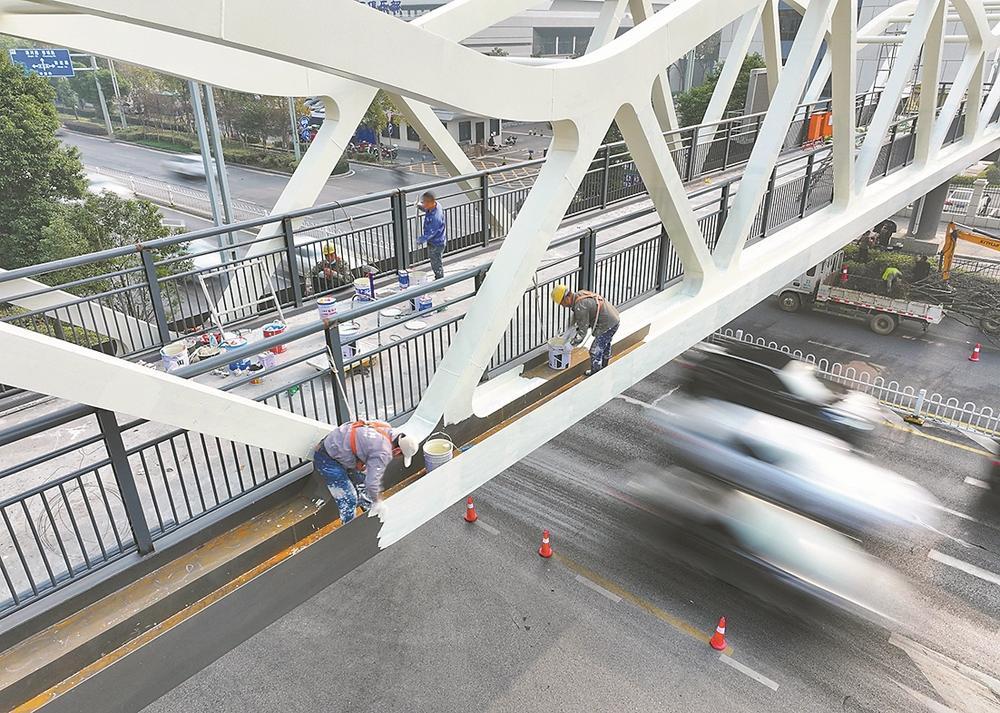 11月4日,在襄阳市三十八中人行过街天桥施工现场,工人们进行收尾工作。该天桥毗邻市三十八中、航天春园小区、青年人才公寓及建安小区等,建成后将有效满足学生与居民的过街需求,保障通行安全,提升出行效率。