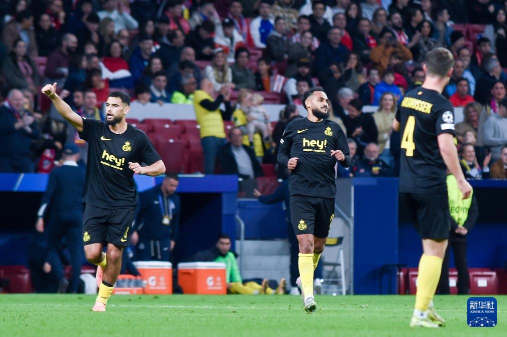 11月4日,马德里竞技队球员在比赛中庆祝进球。
