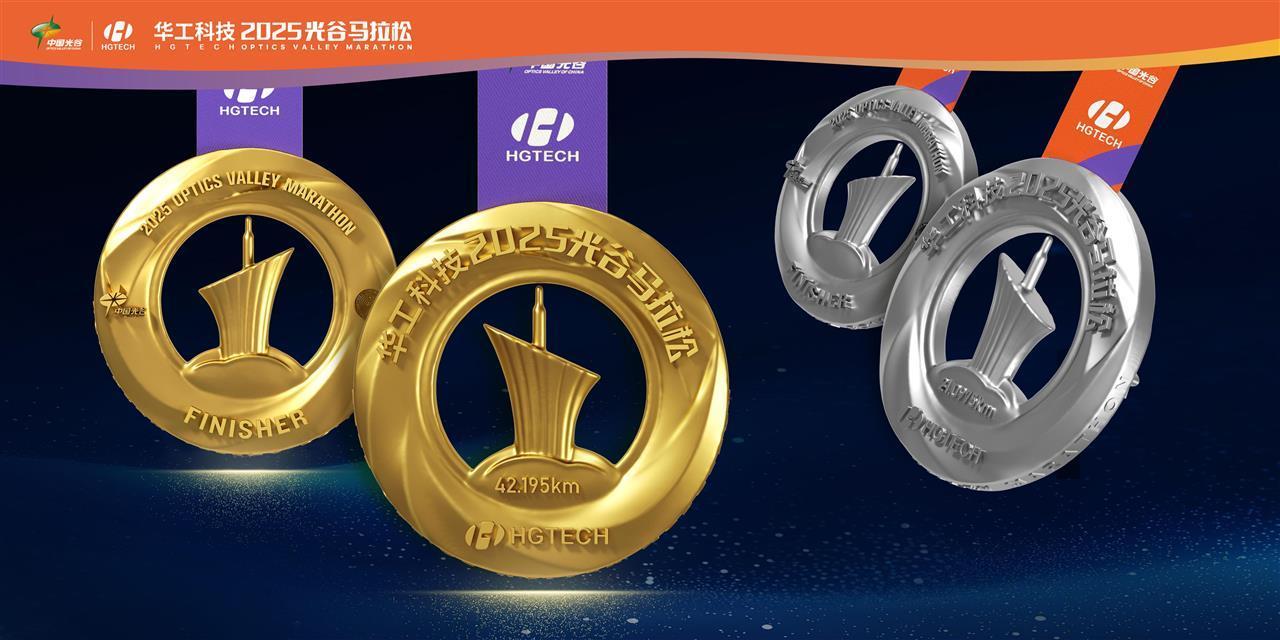 奖牌设计简洁有力,光谷地标马蹄莲环绕其中,将城市印记与运动精神紧密结合。环形设计既象征着奔跑者的轨迹,又寓意着出光谷科创精神与选手竞赛精神的交相辉映,彰显光谷37年创新发展、步履不停的无穷动力,致敬选手挑战自我、奔赴梦想的无限可能。
