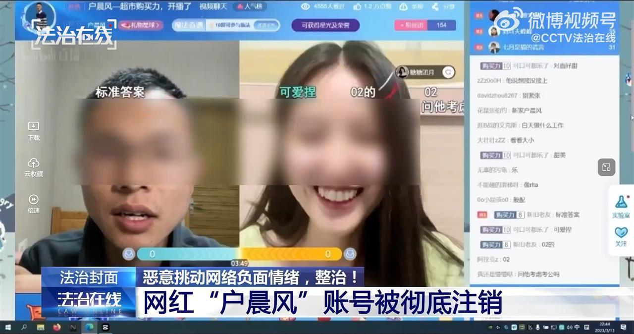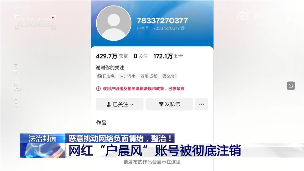 拥有百万粉丝的网红博主户晨风,以你是“苹果人”还是“安卓人”的标签发表言论,恶意制造社会对立,收割流量牟利,突破监管红线。近日,其在多个平台的账号被封禁,内容被清空,随后账号被彻底注销。(据11月5日央视新闻)