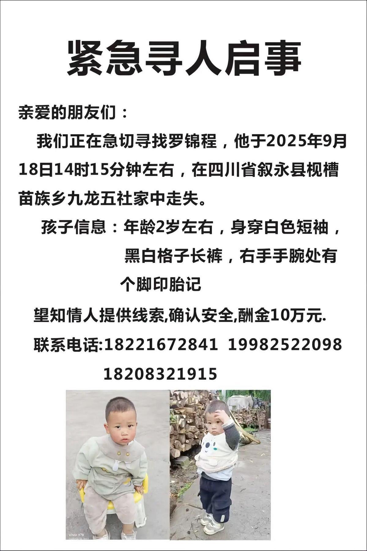 寻人启事显示,2025年9月18日14时15分左右,罗锦程在叙永县枧槽苗族乡九龙五社家中走失,年龄2岁左右,身穿白色短袖黑白格子长裤,右手手腕处有个脚印胎记。