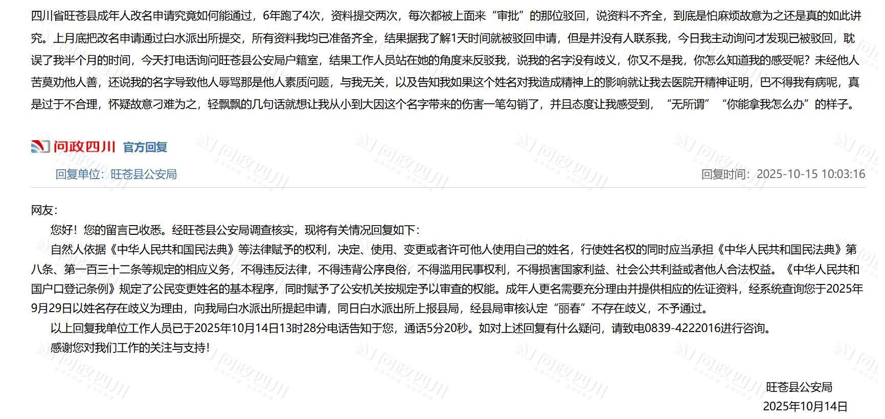10月15日,旺苍县公安局回复该网友称,自然人依据《中华人民共和国民法典》等法律赋予的权利,决定、使用、变更或者许可他人使用自己的姓名,行使姓名权的同时应当承担《中华人民共和国民法典》第八条、第一百三十二条等规定的相应义务,不得违反法律,不得违背公序良俗,不得滥用民事权利,不得损害国家利益、社会公共利益或者他人合法权益。《中华人民共和国户口登记条例》规定了公民变更姓名的基本程序,同时赋予了公安机关按规定予以审查的权能。成年人更名需要充分理由并提供相应的佐证资料,经系统查询您于2025年9月29日以姓名存在歧义为理由,向我局白水派出所提起申请,同日白水派出所上报县局,经县局审核认定“丽春”不存在歧义,不予通过。