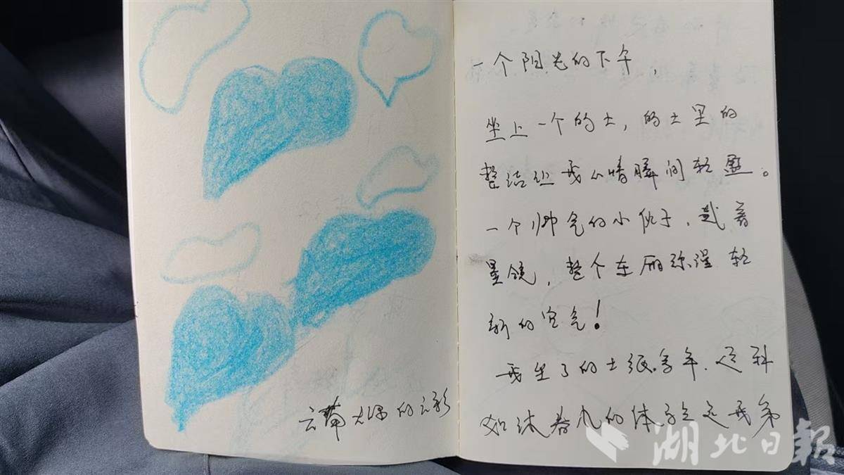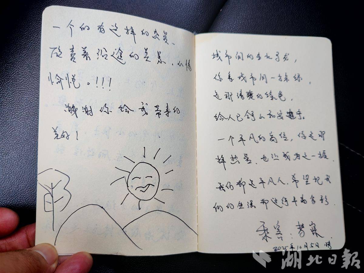 车辆平稳驶入车流,二人从生活日常开启对话。陈女士笑着说起生活中的小事,李松也分享工作中的暖心片段。聊着聊着,陈女士话锋一转,提起前不久的云南大理之旅。随后取出一本彩色封面的留言本,里面记载了她的旅行留言,画着大理天空上棉花糖一样的云彩。她又写上和李松偶遇的感慨,轻轻放进出租车留言箱里,“留言本就留给你了!”