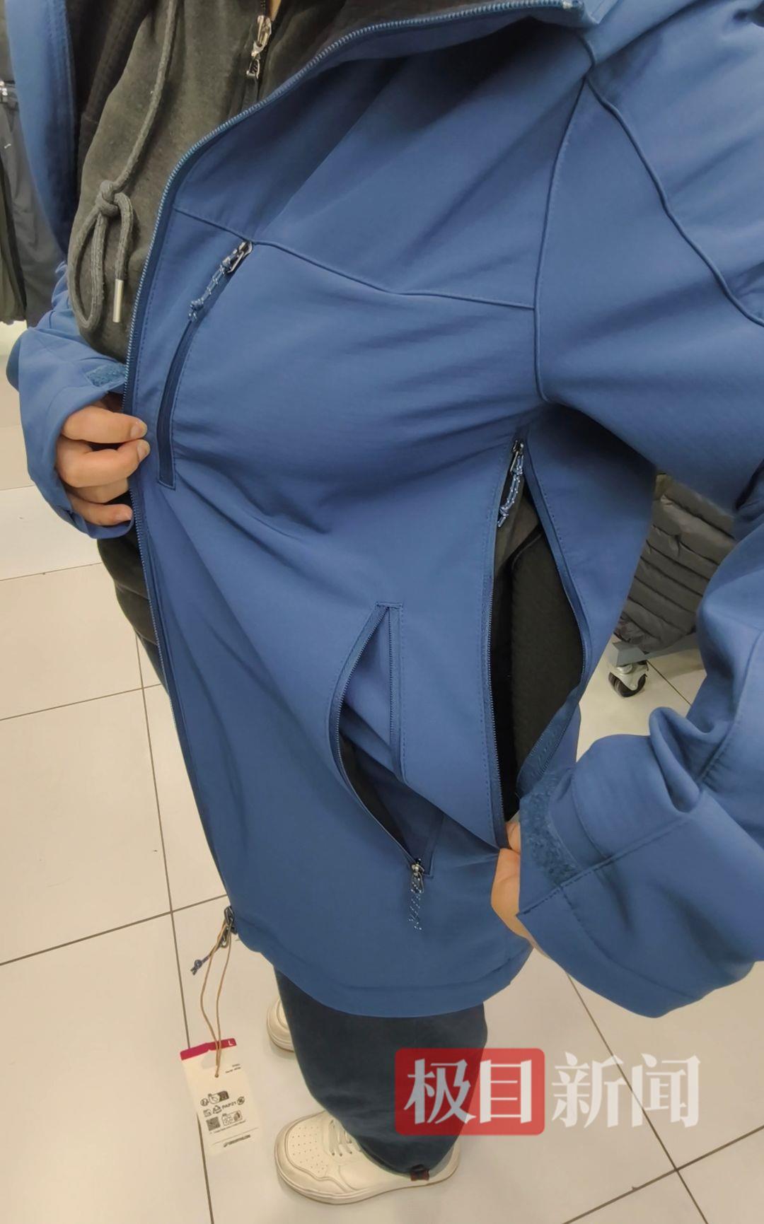 记者注意到,该款外套的口袋与透气孔并列相距三指,两者都有拉链,口袋的拉链自上往下开口,透气孔的拉链自下往上开口。透气孔的拉链更长,打开后确实没有内衬。记者试穿后发现,若口袋和透气孔的拉链都打开时,手插兜时很容易放进没有内衬的透气孔。