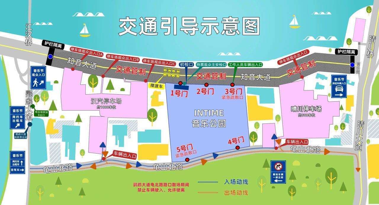 自驾车辆可经鹦鹉大道进入龟山北路抵达汉汽、晴川等停车场。活动结束散场时,龟山北路禁止车辆驶入,所有停车场出入口只出不进。车辆从停车场出口驶出,经龟山北路东、西双向驶离现场。