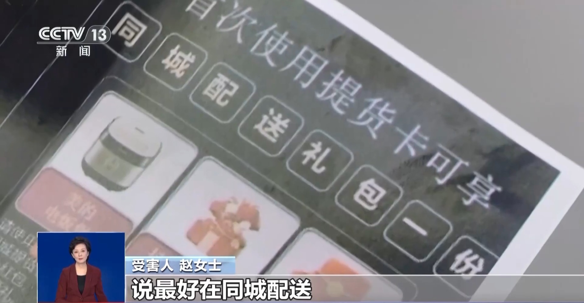 受害人 赵女士:我看了一下提货卡,上面写着,你这个是生鲜产品,说最好在同城配送,因为我想快点收到货,所以扫码下载了软件。