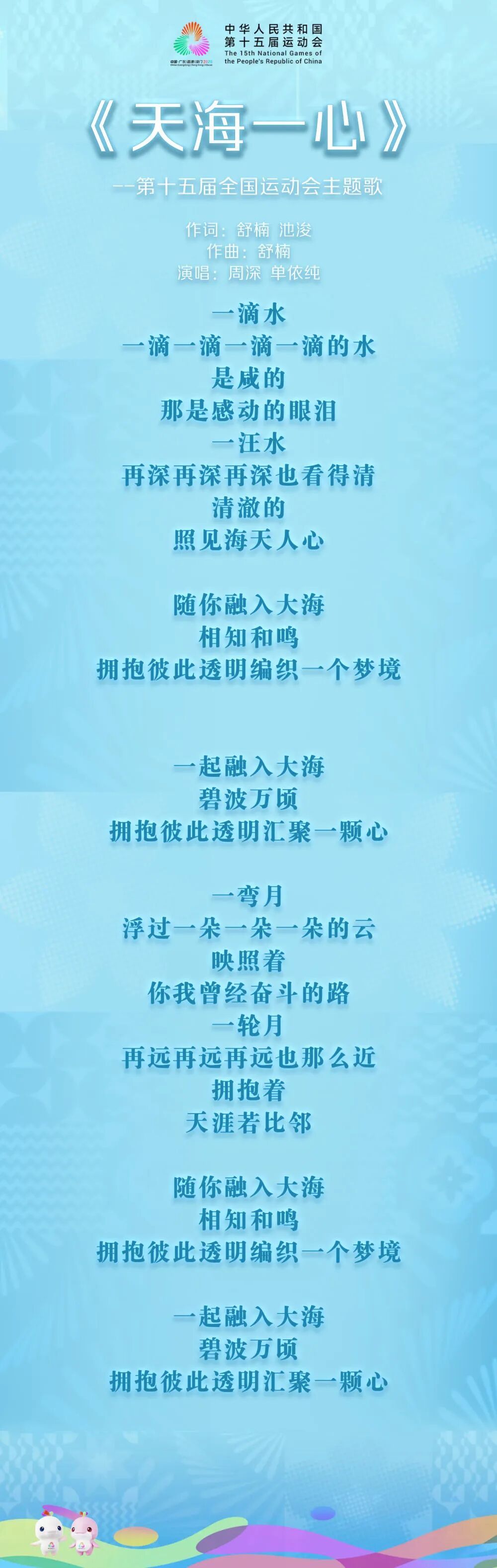 十五运会开幕式总导演郎昆介绍,《天海一心》由国家一级作曲、十五运会开幕式音乐总设计舒楠主导创作,将由周深和单依纯两位歌手在9日晚举行的十五运会开幕式上正式唱响。“当主火炬塔点燃,主题歌《天海一心》响起,天与海的设计理念将表现得淋漓尽致。”