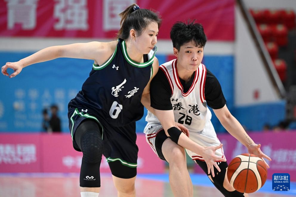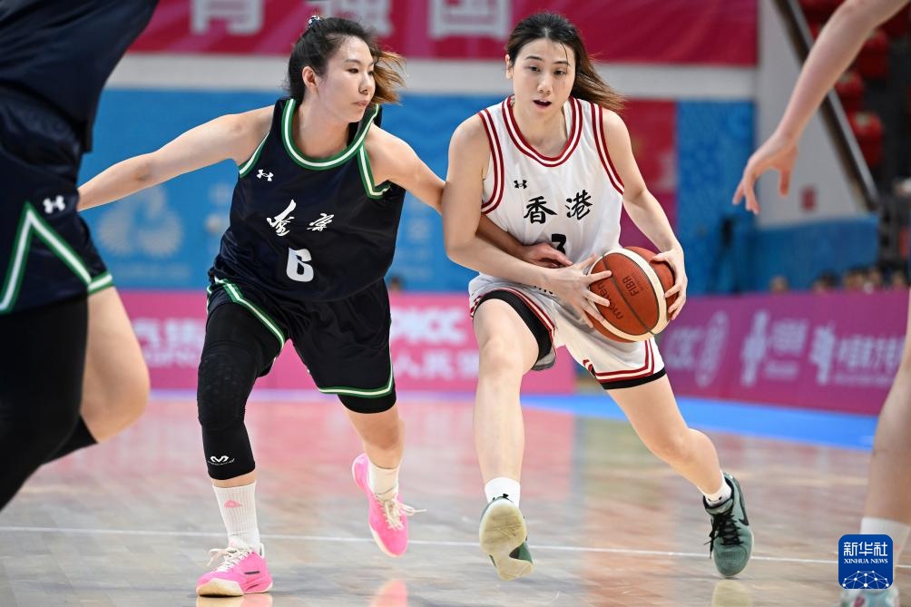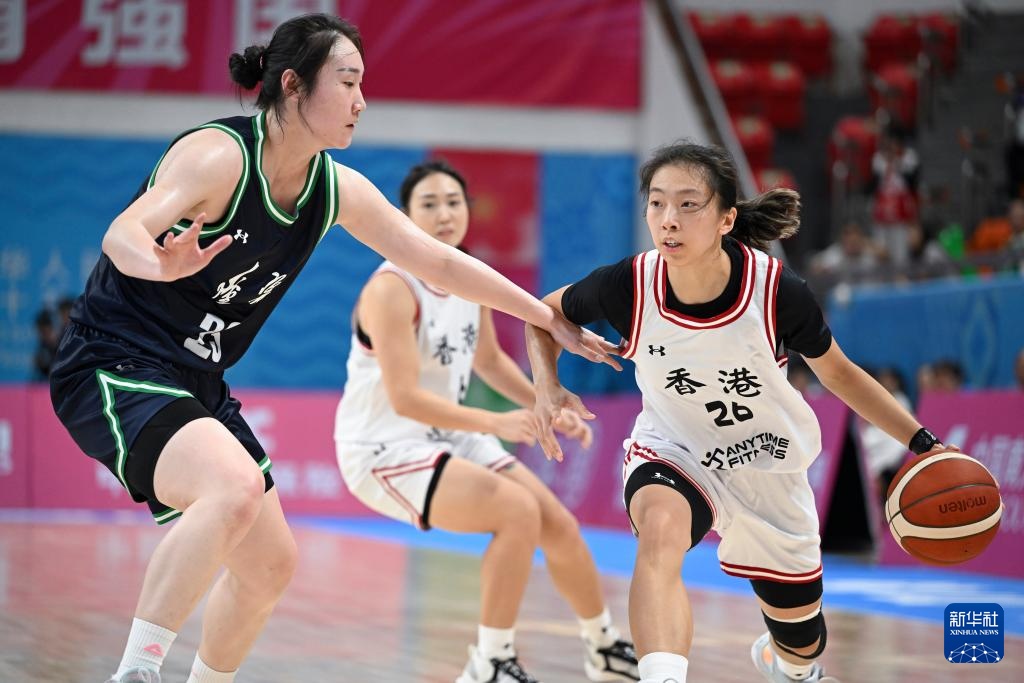 11月7日,香港队球员陈颖欣(右)在辽宁队球员王焱的防守下进攻。