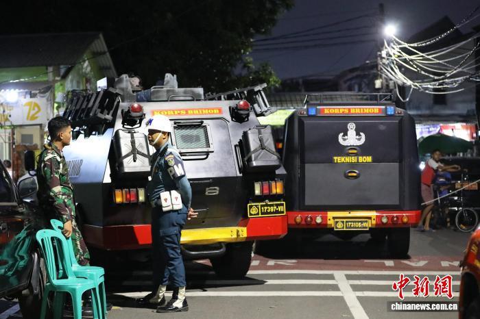 11月7日晚,军警在雅加达国立第72高级中学附近的路口警戒。中新社记者 李志全 摄