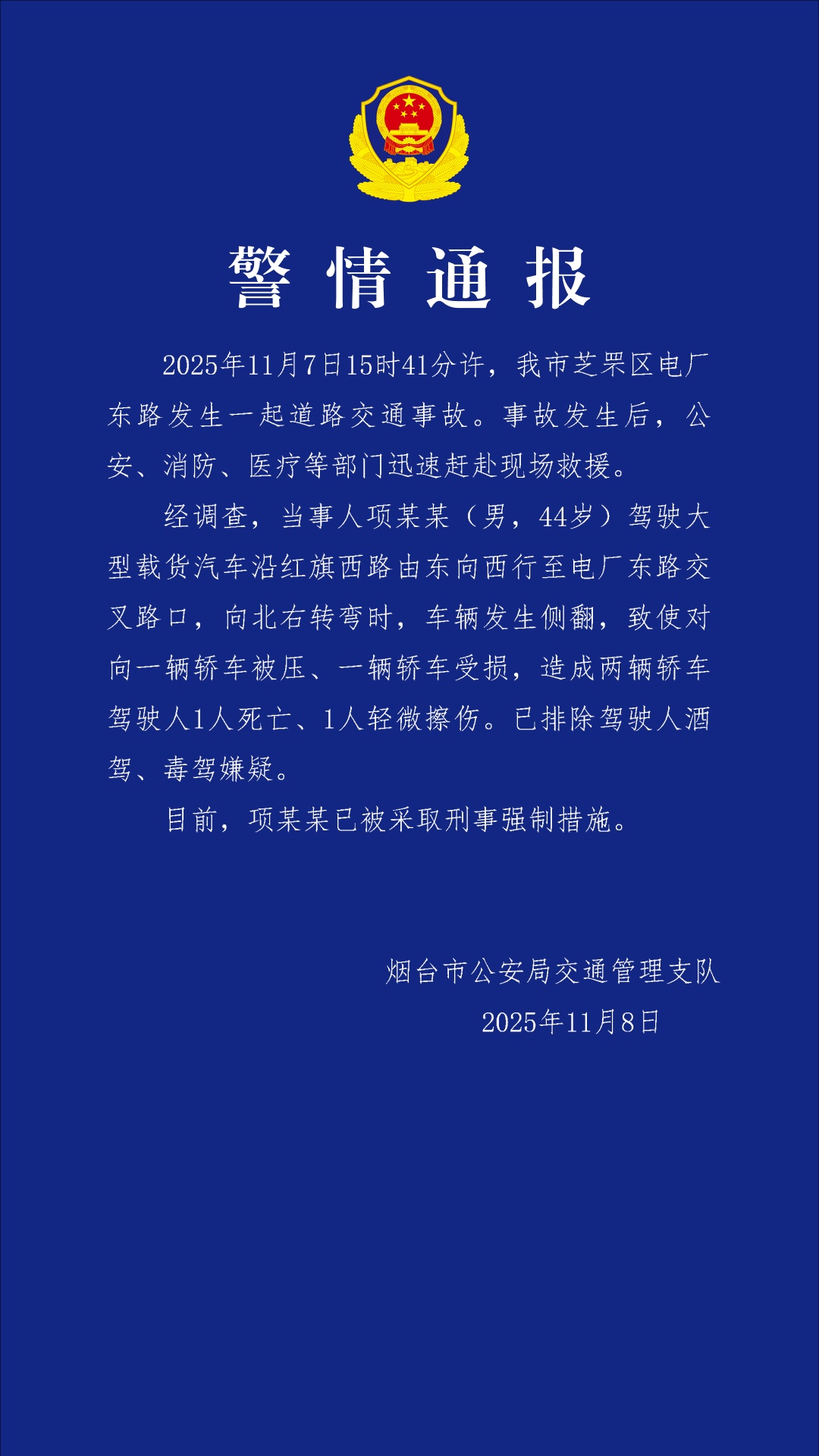 烟台市公安局交通管理支队11月8日发布情况通报: