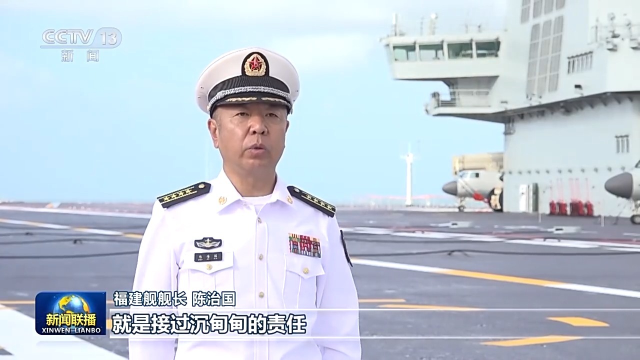 福建舰舰长 陈治国:从习主席手中接过军旗,就是接过沉甸甸的责任。作为我国第一艘电磁弹射型航母的舰长,有信心带领全舰官兵驾驭新型战舰挺进远海大洋,直面风高浪急。当前首要任务是紧前组织新装备性能试验检验,加快提升舰载机满编驻舰保障水平,早日形成编队体系作战能力。我坚信,沿着习主席指明的建设发展路径,福建舰一定能够劈波斩浪,犁开全新航迹,坚决完成党和人民赋予的使命任务。
