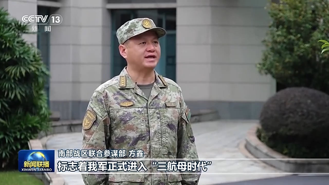 南部战区联合参谋部 方鑫:福建舰加入战斗序列,标志着我军正式进入“三航母时代”,应对复杂局势挑战更加从容,官兵胜战打赢的底气更足。对我们战区来说,必须全面提高联合作战指挥能力,加快研究探索新型作战力量运用方法模式,让“国之重器”真正成为“制胜利器”,推动融入联合作战体系,坚定灵活开展军事斗争,坚决捍卫我国领土主权和海洋权益。