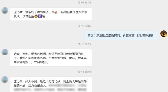 从那之后,我每发一条“蹲点”,TA几乎都会回一条长信息。《蹲点吊香蕉》,TA说,“好有意思,新知识+1,没准可以用在作文里”;《蹲点外贸工厂》,TA说,“之前总听贸易战,不知道是什么意思,现在好像了解了一点”;《蹲点报志愿》,TA说,“留在本地,还是去外地,真的好为难,想问问您的看法……”