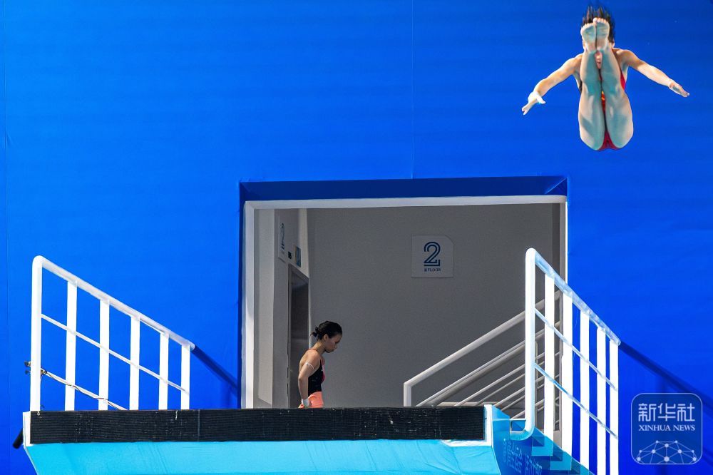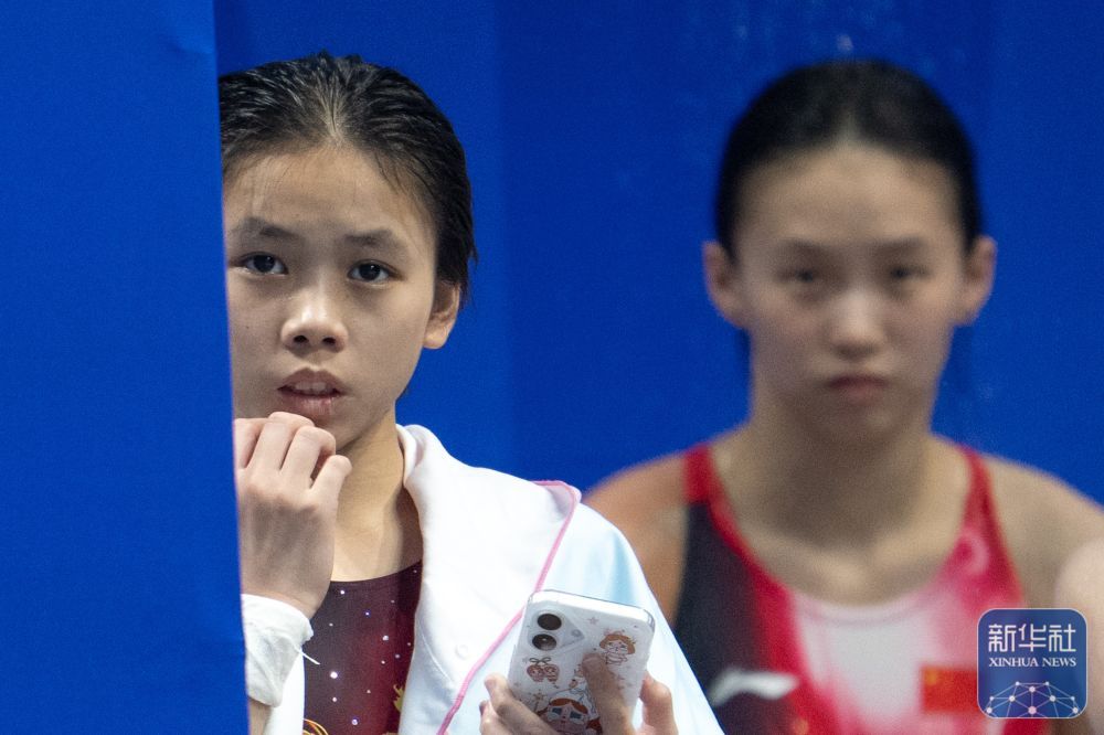 ↑ 上海队选手陈芋汐(左)在赛前热身。最终,她以423.7分的成绩晋级决赛。