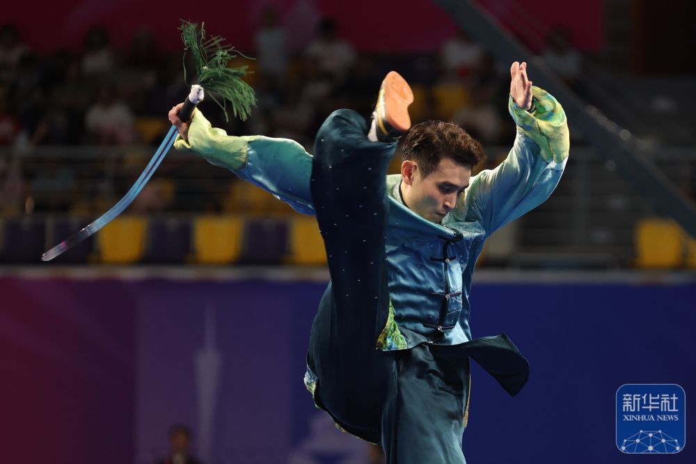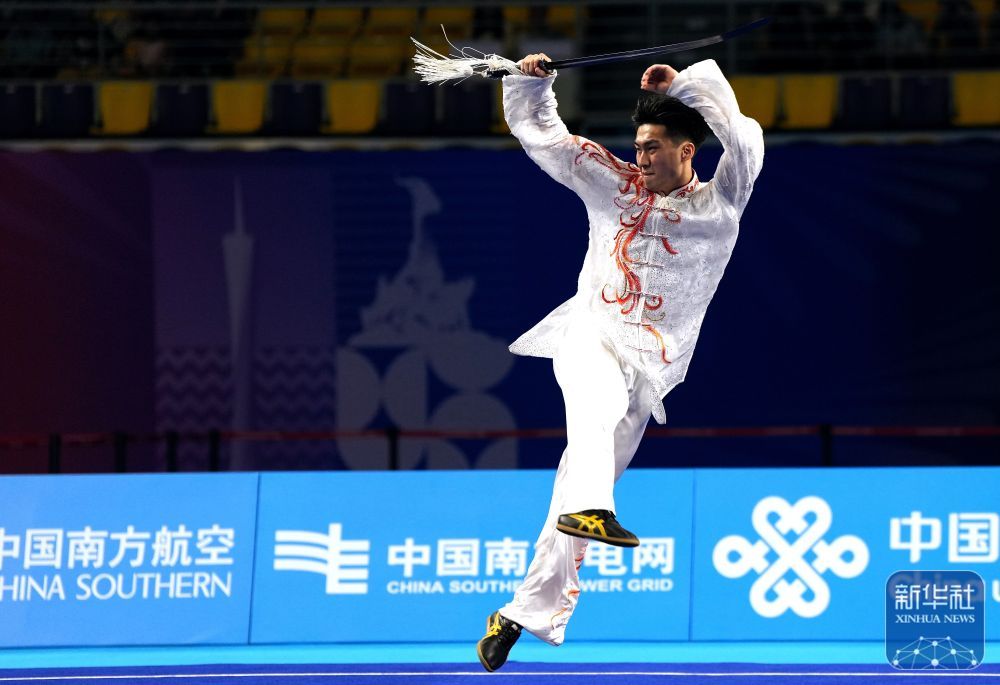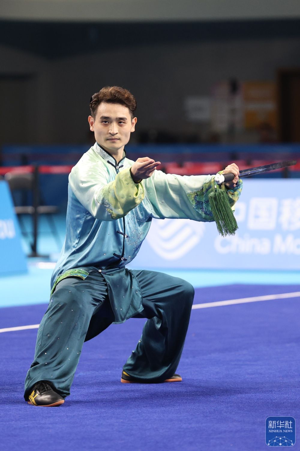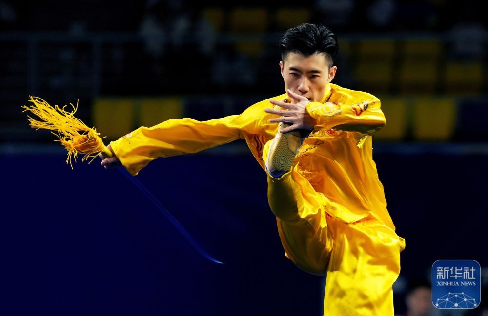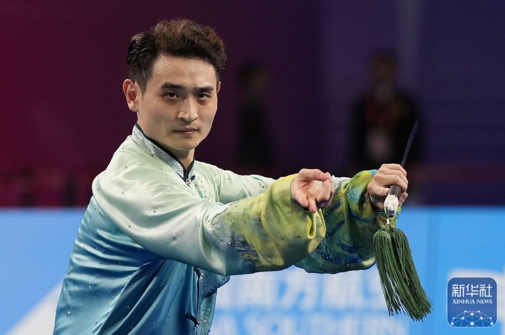 ↑ 福建队选手王彦宇在太极剑比赛中。最终,他获得亚军。 新华社记者 晋美多吉 摄
