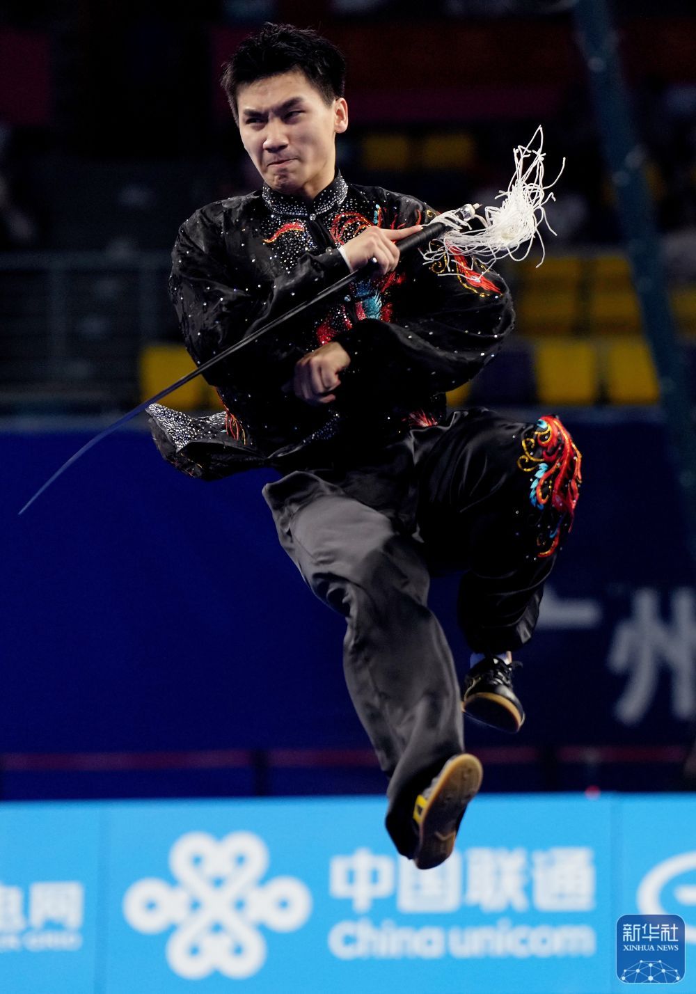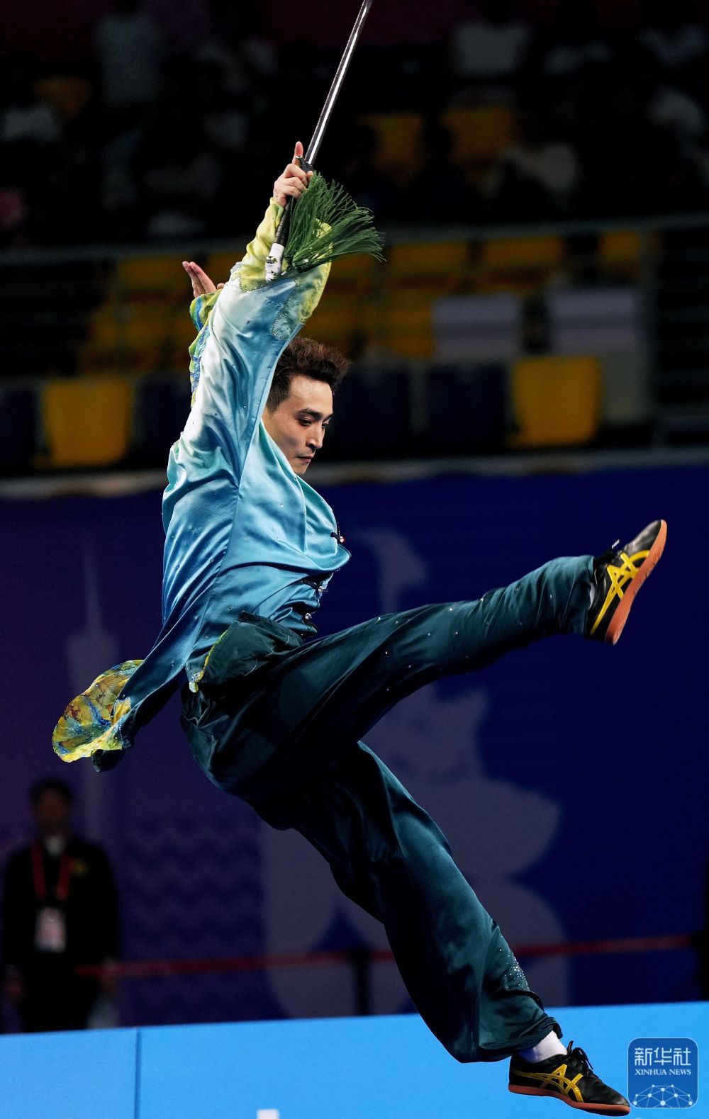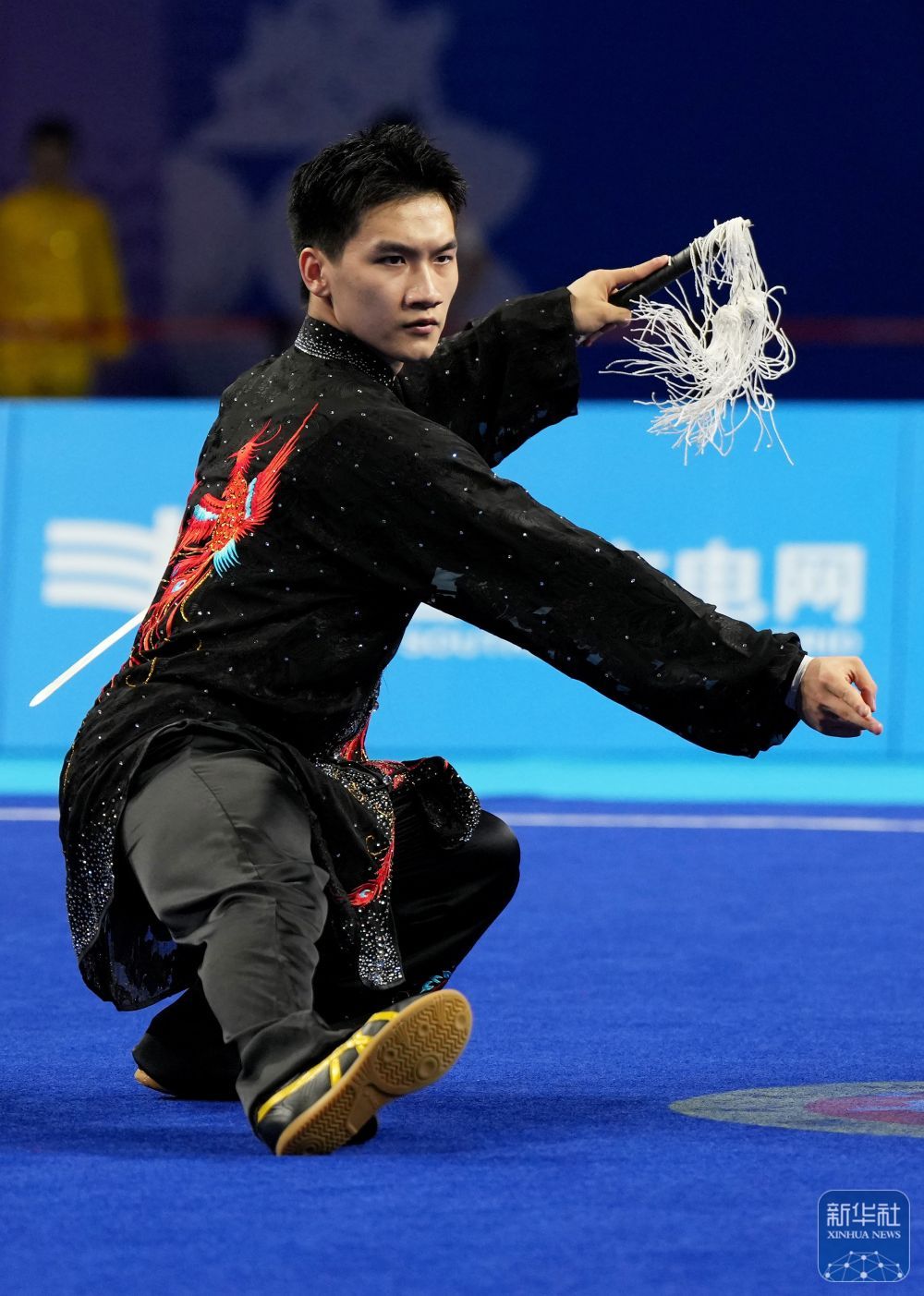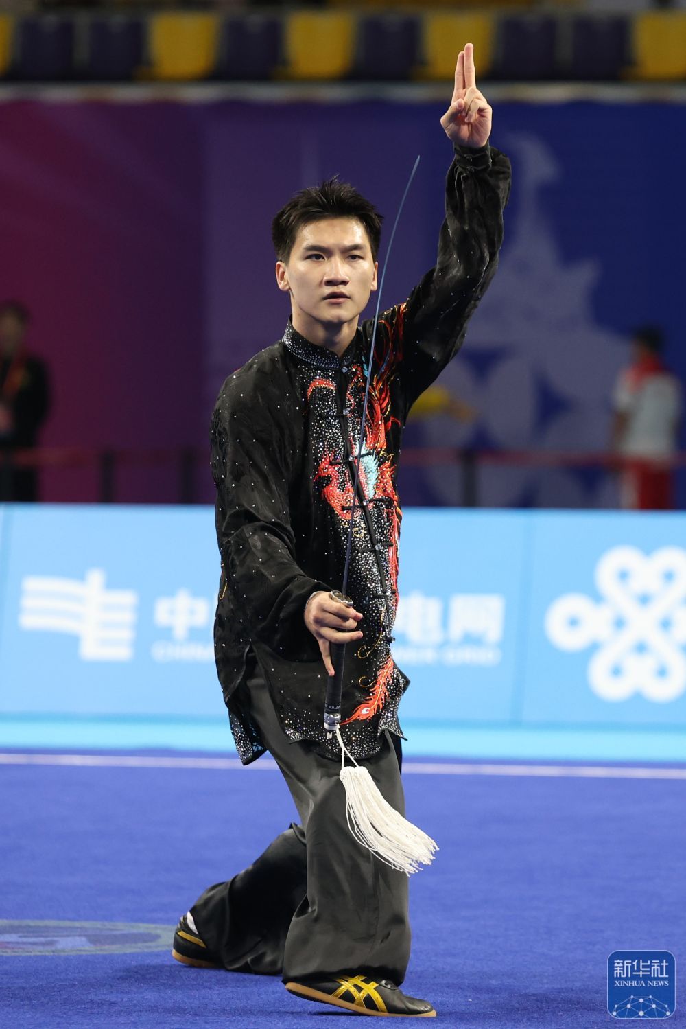↑ 福建队选手王彦宇在太极剑比赛中。最终,他获得亚军。 新华社记者 晋美多吉 摄