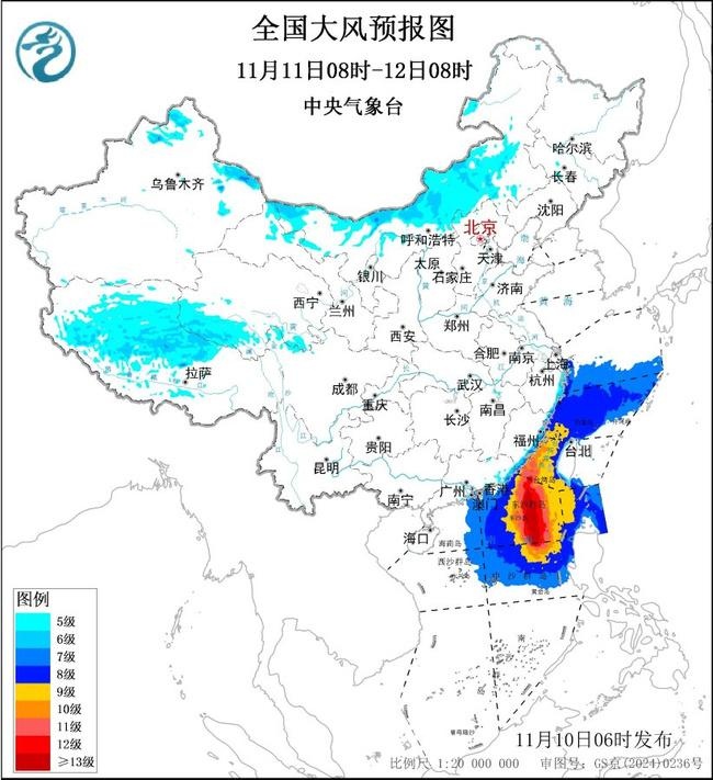 预计,11月10日8时至11日8时,新疆北部、内蒙古中部、河北北部、黑龙江东部、辽东半岛、山东半岛、西藏大部、广东东部沿海、福建沿海、台湾岛南部等地有5~7级、阵风8级的大风;东海南部海域、台湾以东洋面、南海北部和中部海域将有7~8级、阵风9~10级的大风,台湾海峡、巴士海峡、南海东北部和中东部的部分海域风力可达9~11级、阵风12~13级,台风“凤凰”中心经过的附近海域风力有12~14级,阵风15~16级。
