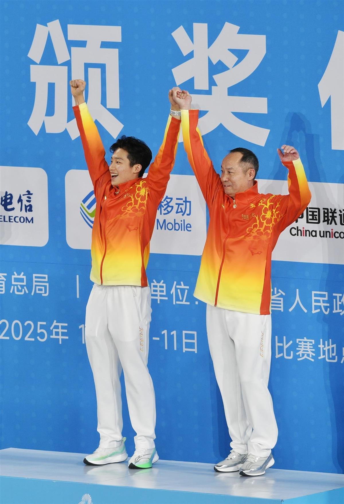 赛后的颁奖仪式上,王宗源、郑九源和教练跳着站上领奖台。他们挥手向看台上的观众致意。和他们同在国家队的广东队选手全红婵也来到现场,她挂着王宗源、郑九源的奖牌分别和两人合影,调皮地送上祝贺。