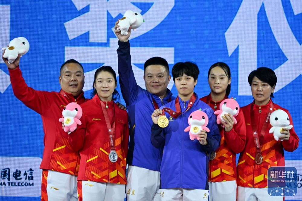 ↑ 获得冠军的福建队选手魏婷娜(右三)、获得亚军的重庆队选手苏婷婷(左二)、获得季军的重庆队选手刘梦佳(右二)在颁奖仪式上与教练合影。