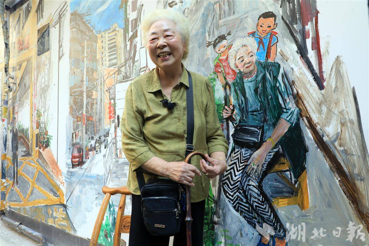 硚口墙绘——婆婆与画中的她。(通讯员肖敏摄)