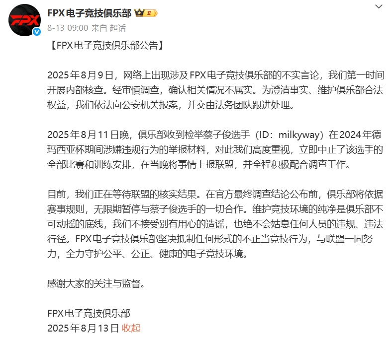 在今年的8月份,有网友在微博上举报Milkyway在效力RNG俱乐部期间,在2024年德玛西亚杯小组赛中,私自泄露队内模拟BP信息(英雄选择与战术安排),并公布多张聊天记录,对此FPX官方发布公告称:立即中止Milkyway的全部比赛和训练安排,在当晚将事情上报联盟,并全程积极配合调查工作。