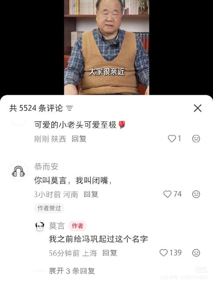 有网友说:你叫莫言,我叫闭嘴。莫言回复:我之前给冯巩起过这个名字。