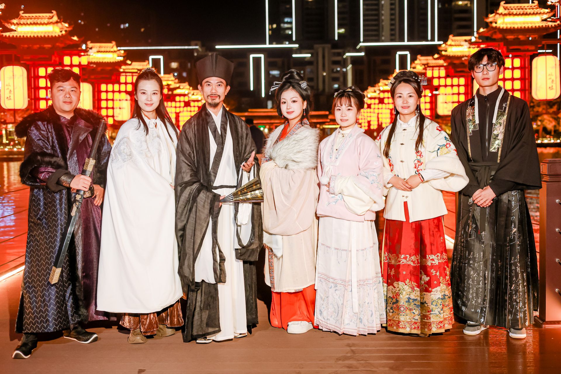 船靠码头时,夜色正浓。还原苏轼形象的文旅博主陈明超,巧遇身着仿宋服饰的本地文旅宣传团队,青衫广袖与宋制襦裙相映成趣,瞬间拉满穿越感。大V们纷纷驻足,用镜头捕捉游人与千年诗词的共鸣瞬间。当千年东坡文化遇上现代科技,当荆楚古韵碰撞网络传播,遗爱湖夜游不仅点亮了城市的夜晚,更照亮了传统文化走向大众的新路径。
