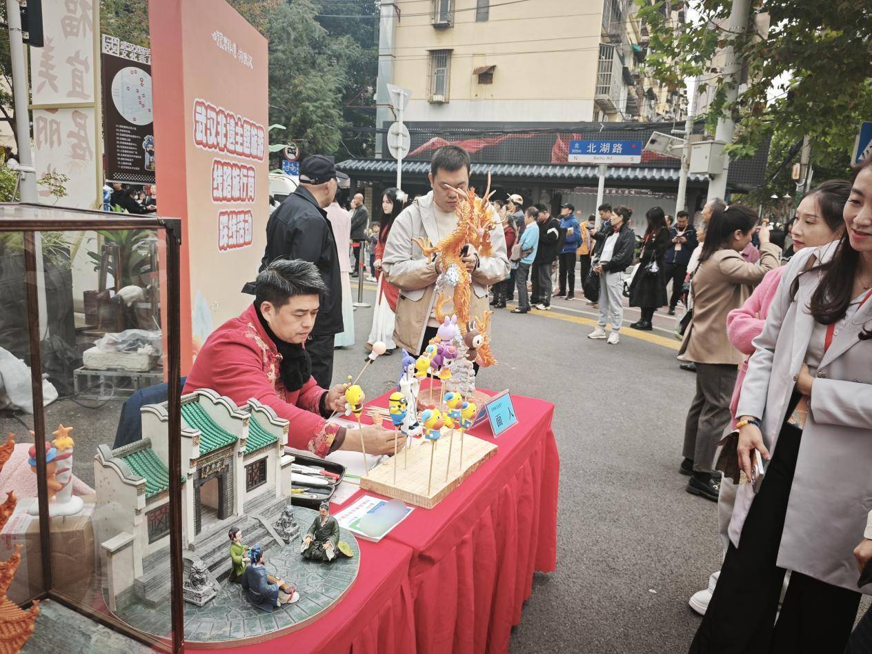 11月12日,“武汉非遗主题旅游线路旅行商踩线活动”来到武汉戏码头文化街社区,同样有一位低头苦干的“面人”在街头吸引了市民的关注。