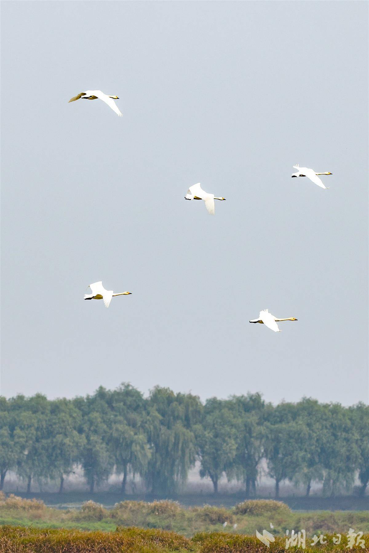图为小天鹅在湿地上空盘旋飞翔。