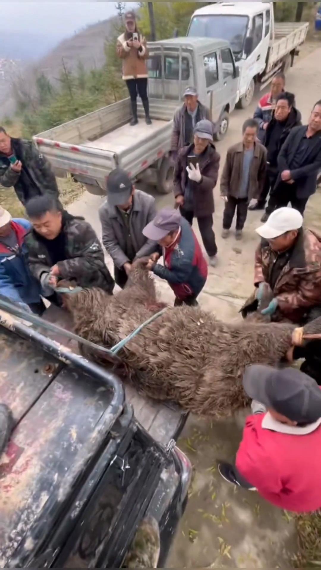 护农队成员蔡先生介绍,11日上午,护农队3名队员和当地村民一起,7人合力,才将这只野猪拖下山,村民预估野猪超过400斤重。队长邓先生告诉极目新闻记者,该护农队共有8名队员,包括无人机飞手、机油手、司机等,还有30多条成年猎犬。
