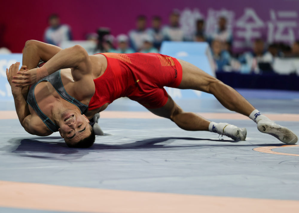 男子古典式摔跤77公斤级决赛,赛会一号种子、山东队刘瑞与二号种子新疆队巴合江·哈力山上演巅峰对决。开场仅12秒,刘瑞在一次进攻中手指不慎脱臼,经过医疗处理后,这位上届全运会该项目银牌得主展现出极强的韧性,上半场通过跪撑进攻连拿4分。下半场,巴合江进攻更加积极,试图扭转局势,但未能把握住机会,比分定格在4:1,刘瑞夺得冠军。