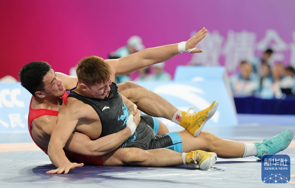 ↑ 重庆队选手李一鸣(上)与新疆队选手阿力木拉提·达拉吾拜在金牌赛中。