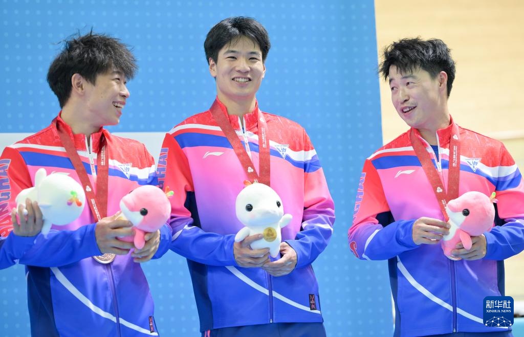 11月13日,冠军河南队选手唐浩举(右七)、刘琦(右六)、冯钰生(右五),亚军浙江队选手詹泽伟(左五)、陆家辰(左四)、徐家壕(左二)、替补选手严炜明(左三),季军上海队选手王海洲(右一)、周瑜(右二)、金智恒(右三)在颁奖仪式上和教练合影。