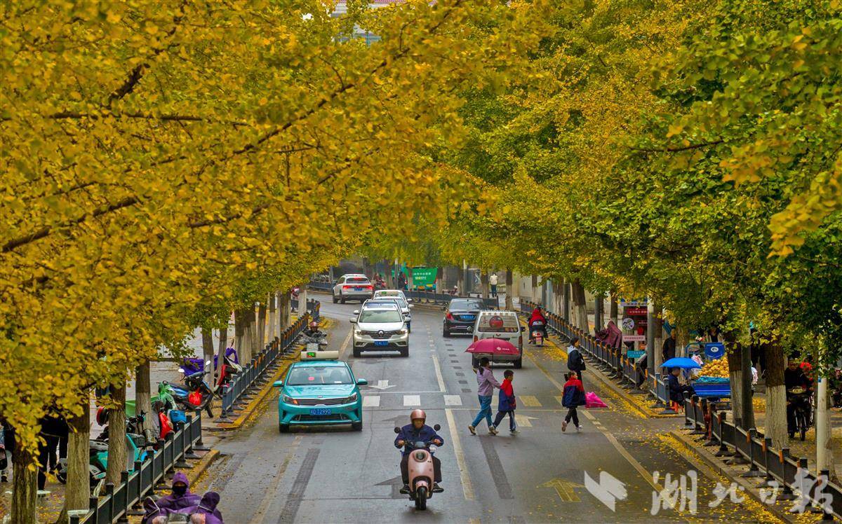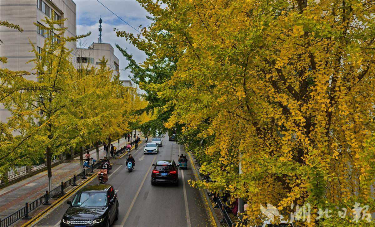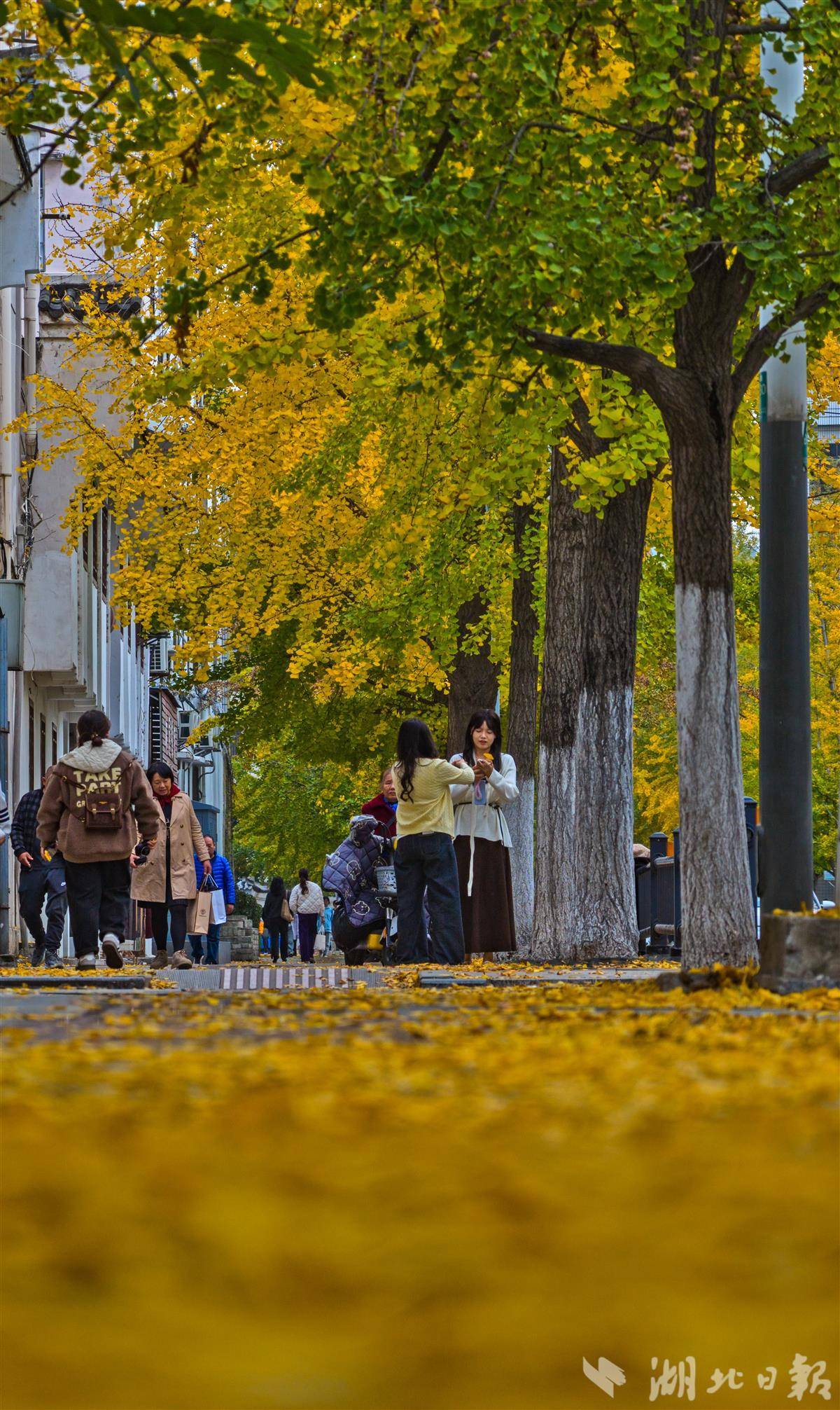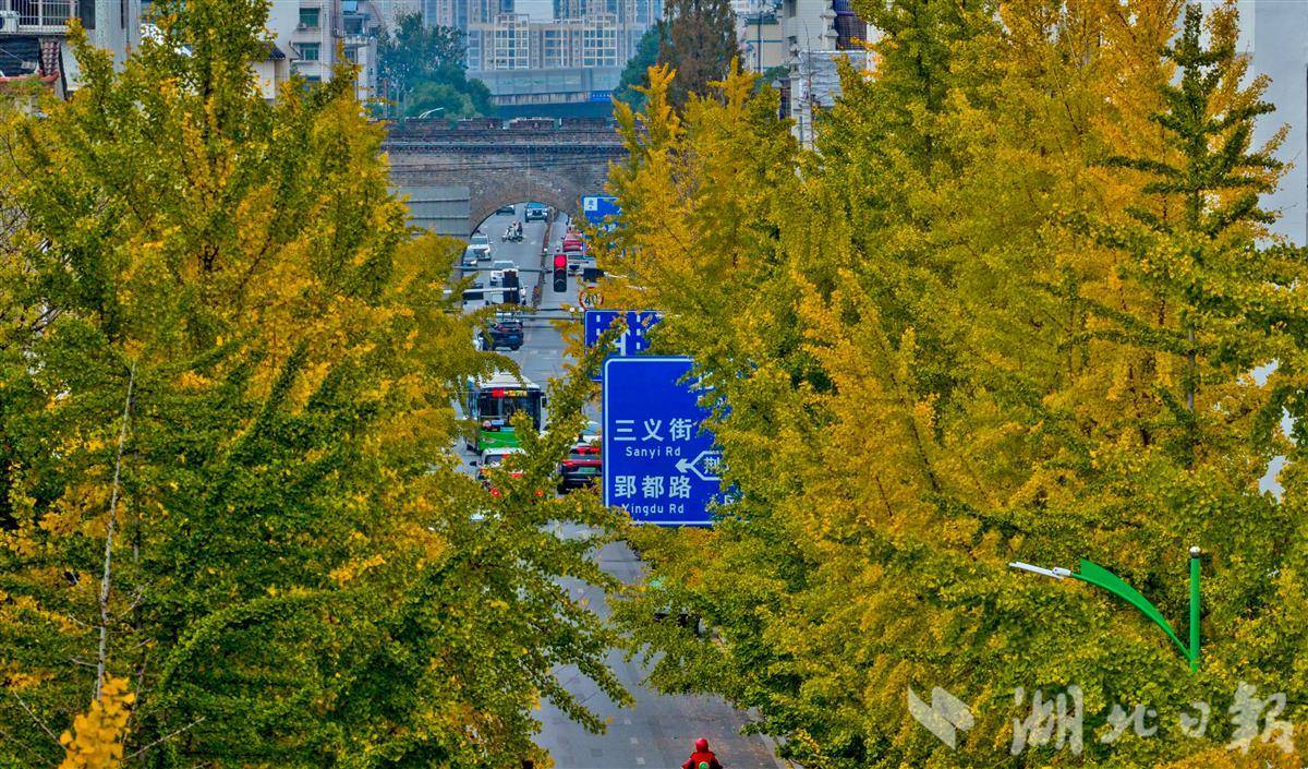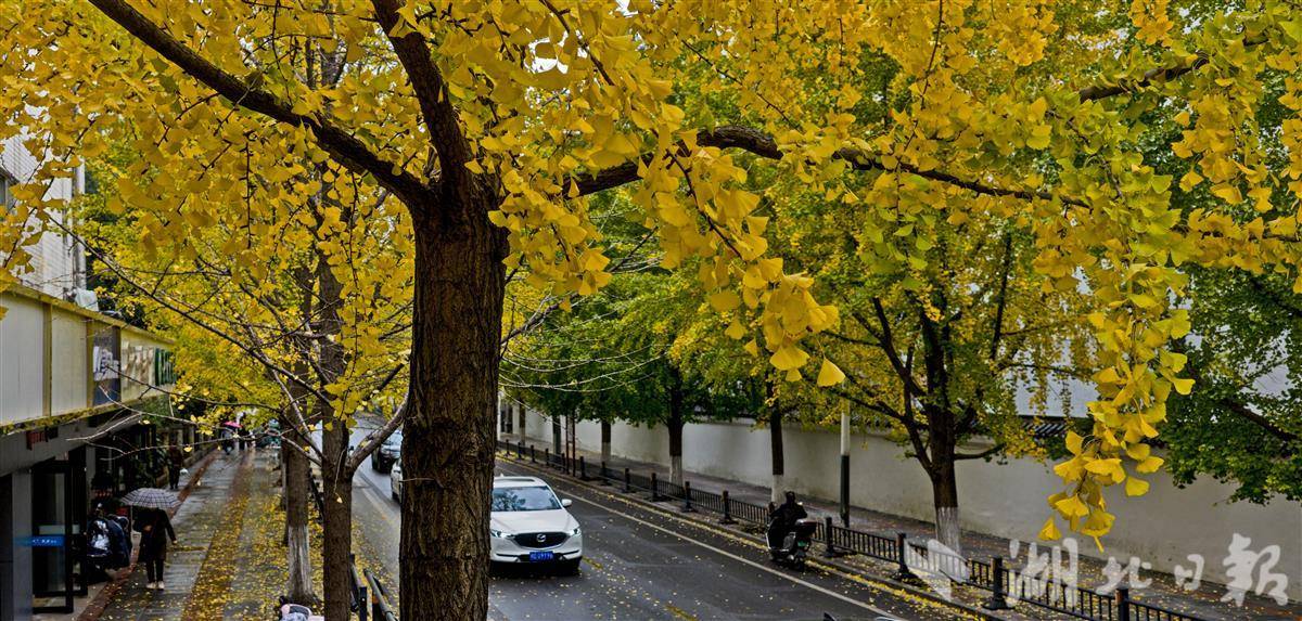 11月11日,荆州古城人民路上的银杏树迎来最佳观赏期,满树金黄与古老城墙相映成趣,为深秋的古城添上一抹亮色,吸引众多市民前来打卡留念。