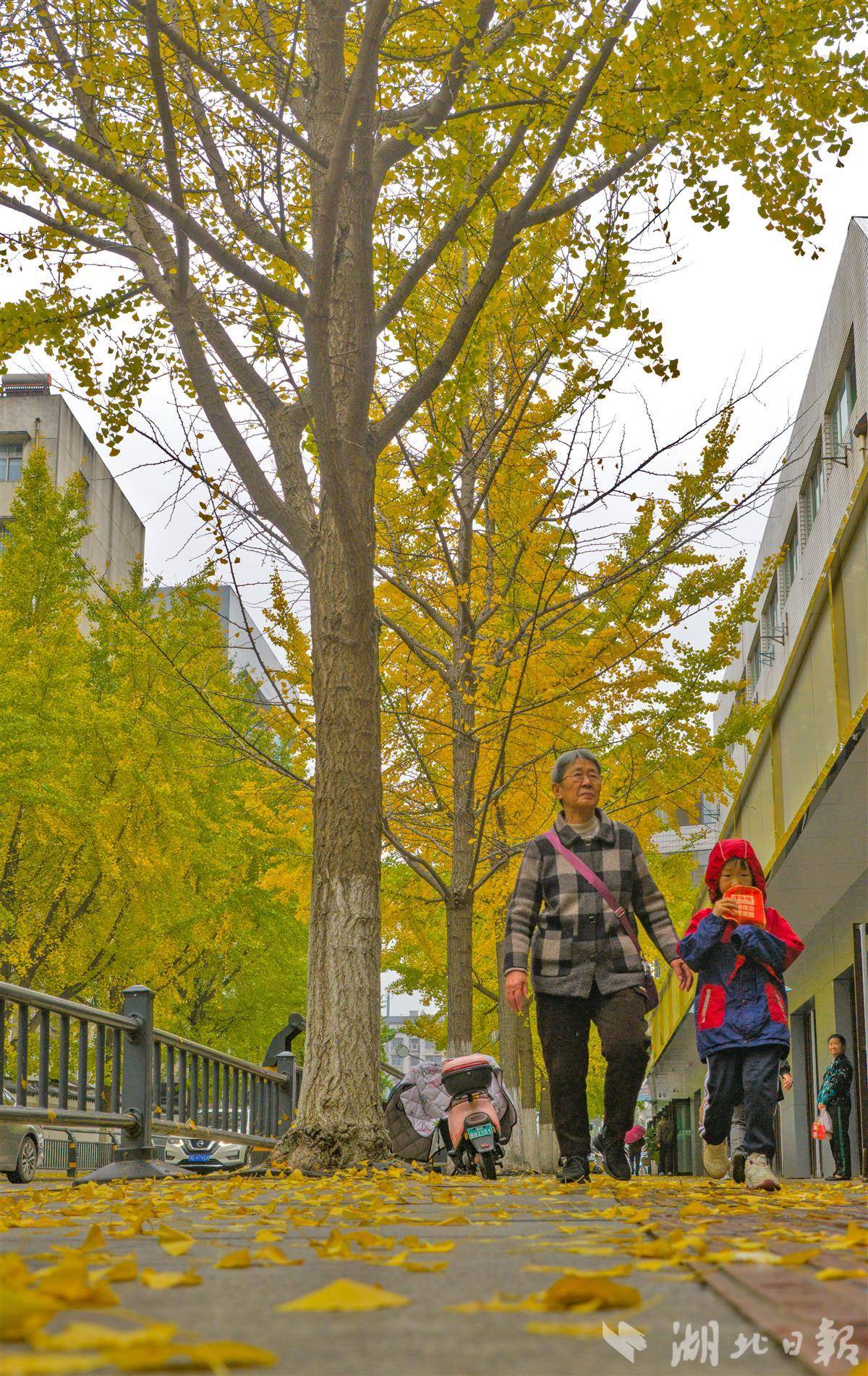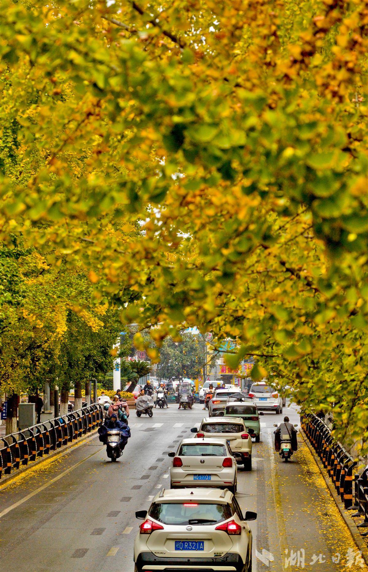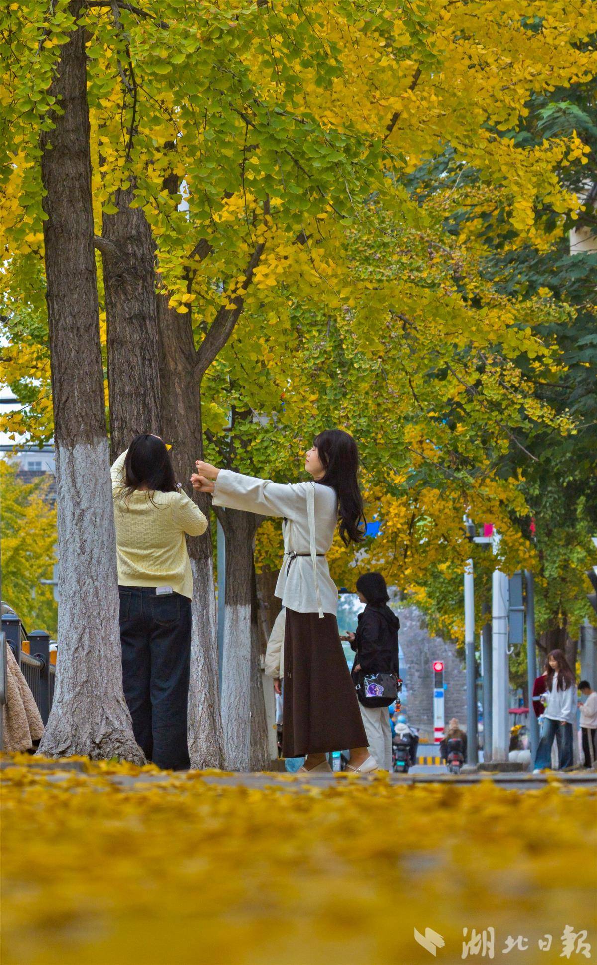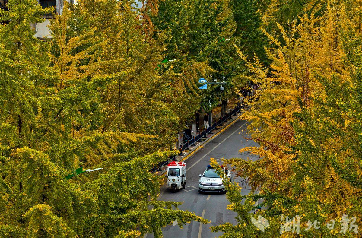 11月11日,荆州古城人民路上的银杏树迎来最佳观赏期,满树金黄与古老城墙相映成趣,为深秋的古城添上一抹亮色,吸引众多市民前来打卡留念。