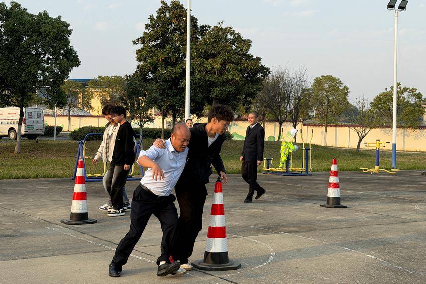 "安全同行三人四足"项目模拟了应急疏散场景,要求三名队员协同前进,从"危险区"快速转移至"安全区"。这个项目不仅考验着队员之间的默契配合,更生动诠释了在紧急情况下团队协作的重要性。任何一个人的步伐紊乱都会影响整体前进速度,唯有团结一致、相互扶持,才能安全高效地完成应急疏散任务。