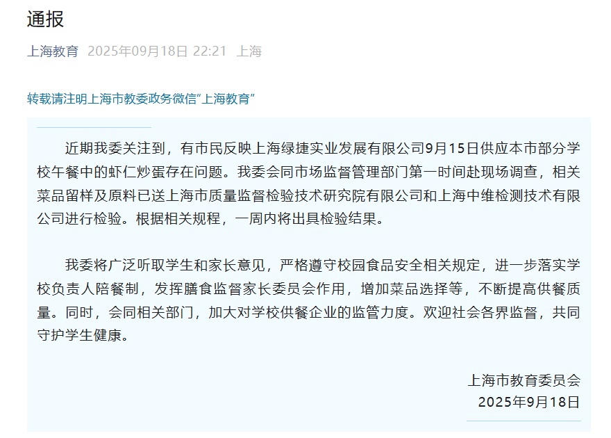 近期我委关注到,有市民反映上海绿捷实业发展有限公司9月15日供应本市部分学校午餐中的虾仁炒蛋存在问题。我委会同市场监督管理部门第一时间赴现场调查,相关菜品留样及原料已送上海市质量监督检验技术研究院有限公司和上海中维检测技术有限公司进行检验。根据相关规程,一周内将出具检验结果。