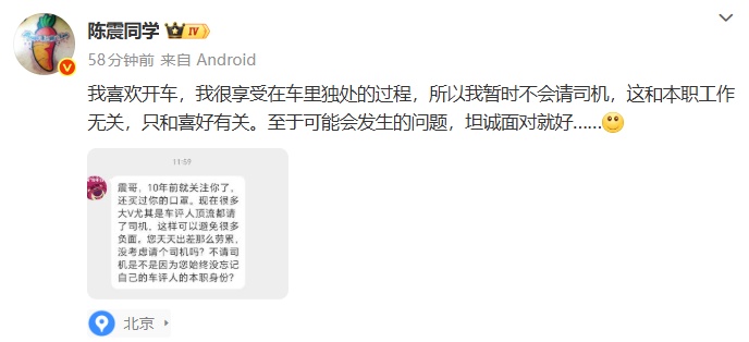 陈震回应,“我喜欢开车,我很享受在车里独处的过程,所以我暂时不会请司机,这和本职工作无关,只和喜好有关。至于可能会发生的问题,坦诚面对就好……”