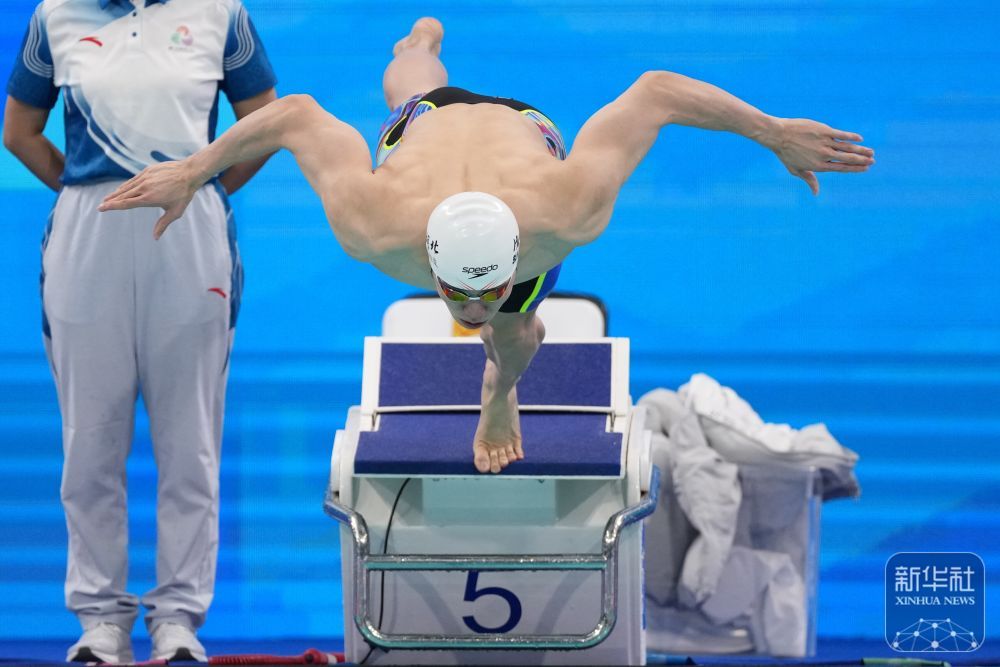 ↑ 湖北队选手孙佳俊在男子100米蝶泳预赛中出发。他晋级半决赛。