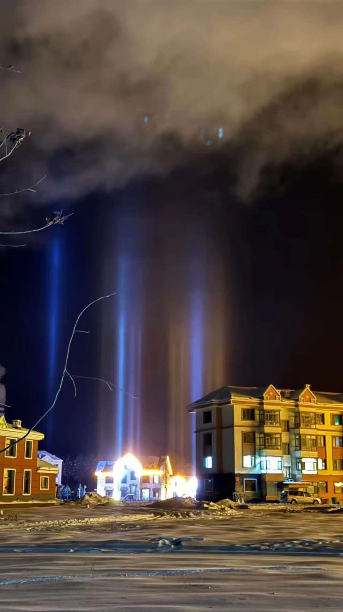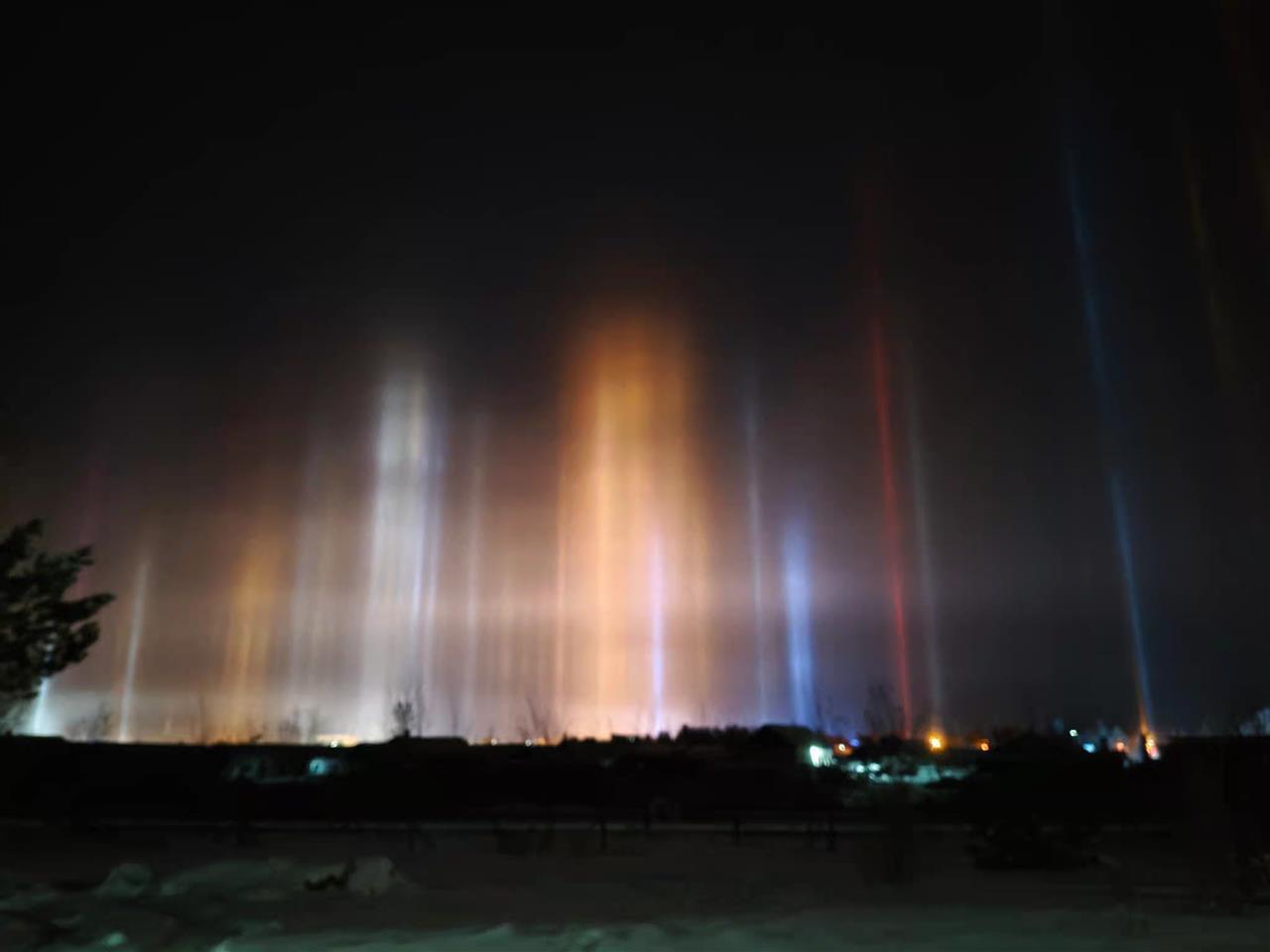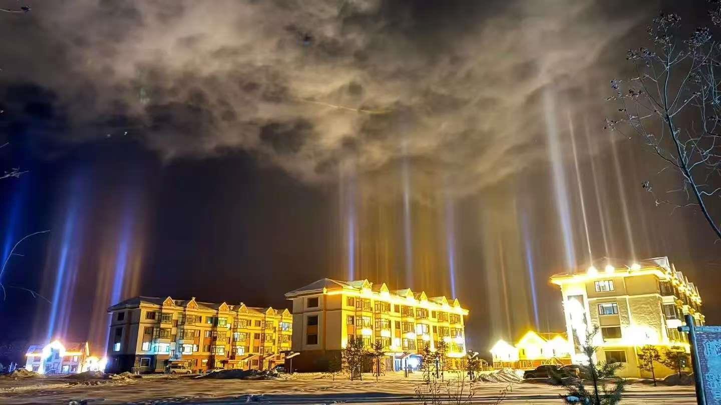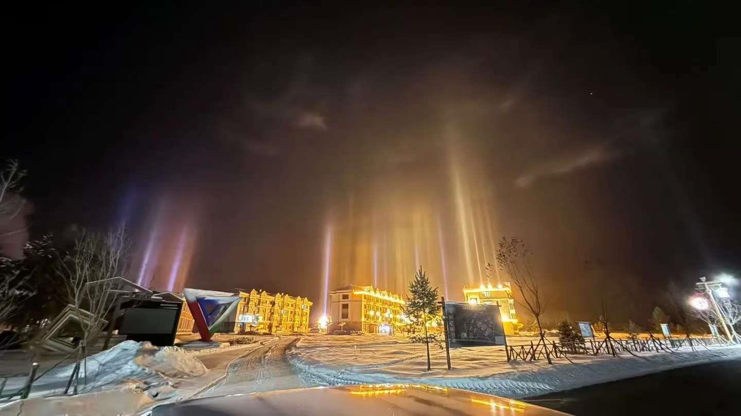 据了解,内蒙古锡林郭勒盟、新疆克拉玛依等多地在冬季低温时出现过罕见的“寒夜光柱”奇观。“寒夜灯柱”是一种罕见的冰晕现象,由大气中的冰晶反射灯光而形成,绝美程度可与极光比肩。在冰晶的反射机制下,城市的路灯、霓虹灯、汽车大灯都化作彩色光柱,直上云霄。