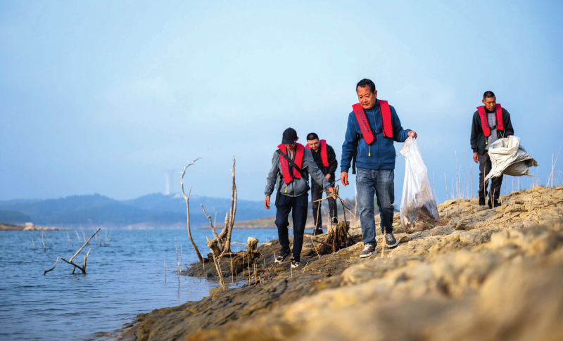 清漂队员在南水北调中线工程的水源地丹江口库区小岛上清理垃圾(2024年10月28日摄)伍志尊摄/本刊