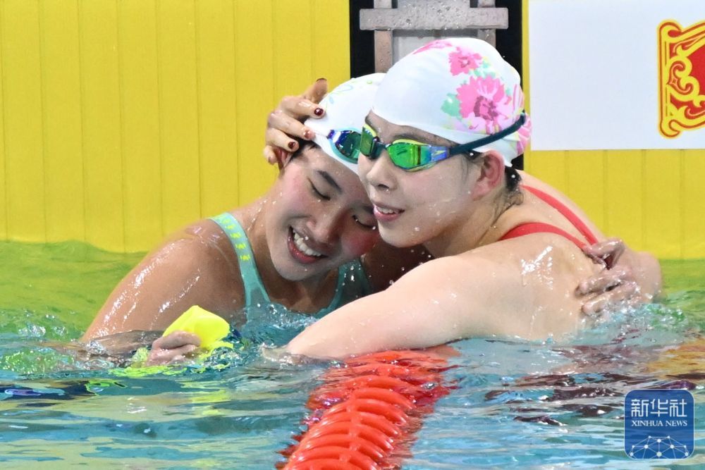↑ 云南队选手朱蕾桔(右)祝贺江苏队选手吕沁遥夺冠。朱蕾桔获得季军。 新华社记者 陈益宸 摄