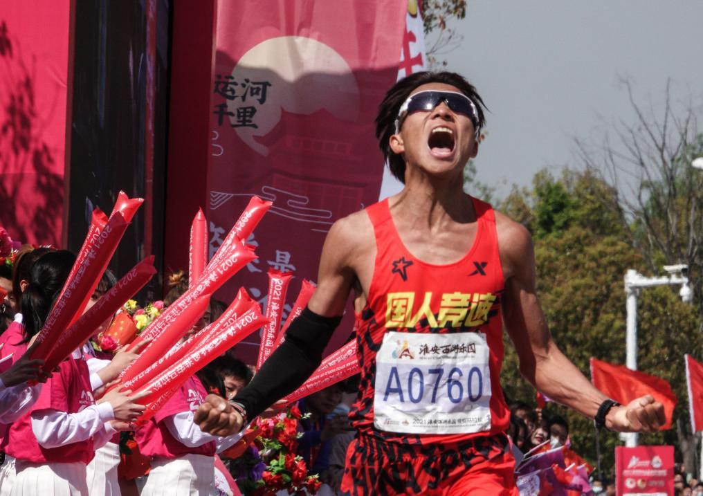 2021年4月18日,参加淮安马拉松赛的何杰冲过终点。他以2小时14分14秒的成绩获得男子组第一名。新华社记者 杨磊 摄