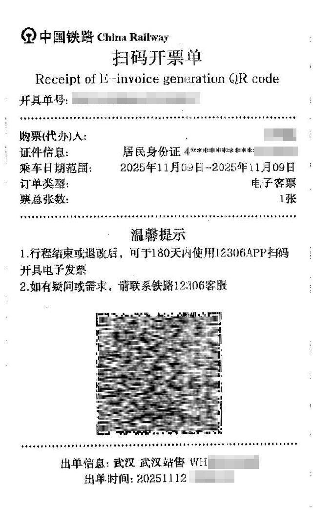 11月12日,李先生赶至武汉站售票窗口。工作人员让他出具身份证及订单号,随即打印了一张“扫码开票单”。李先生用自己的12306APP扫码开票单上的二维码,先后填写本人和乘车人身份证号后8位数,进入开票页面,填写发票抬头、税号等信息,获取电子发票。