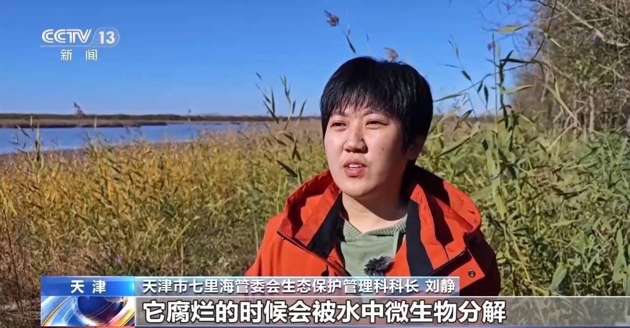 天津市七里海管委会生态保护管理科科长 刘静:芦苇作为有机物,腐烂时会被水中微生物分解,然后这个过程会消耗水中大量的溶解氧,导致水生生物比如鱼虾的一些缺氧死亡,破坏水体生态平衡,也间接影响了鸟类的食物链。而且分解过程中,芦苇体内的氮、磷等营养物质会释放到水体当中,导致水体富营养化,极易引发蓝藻等大量繁殖,从而恶化水质。