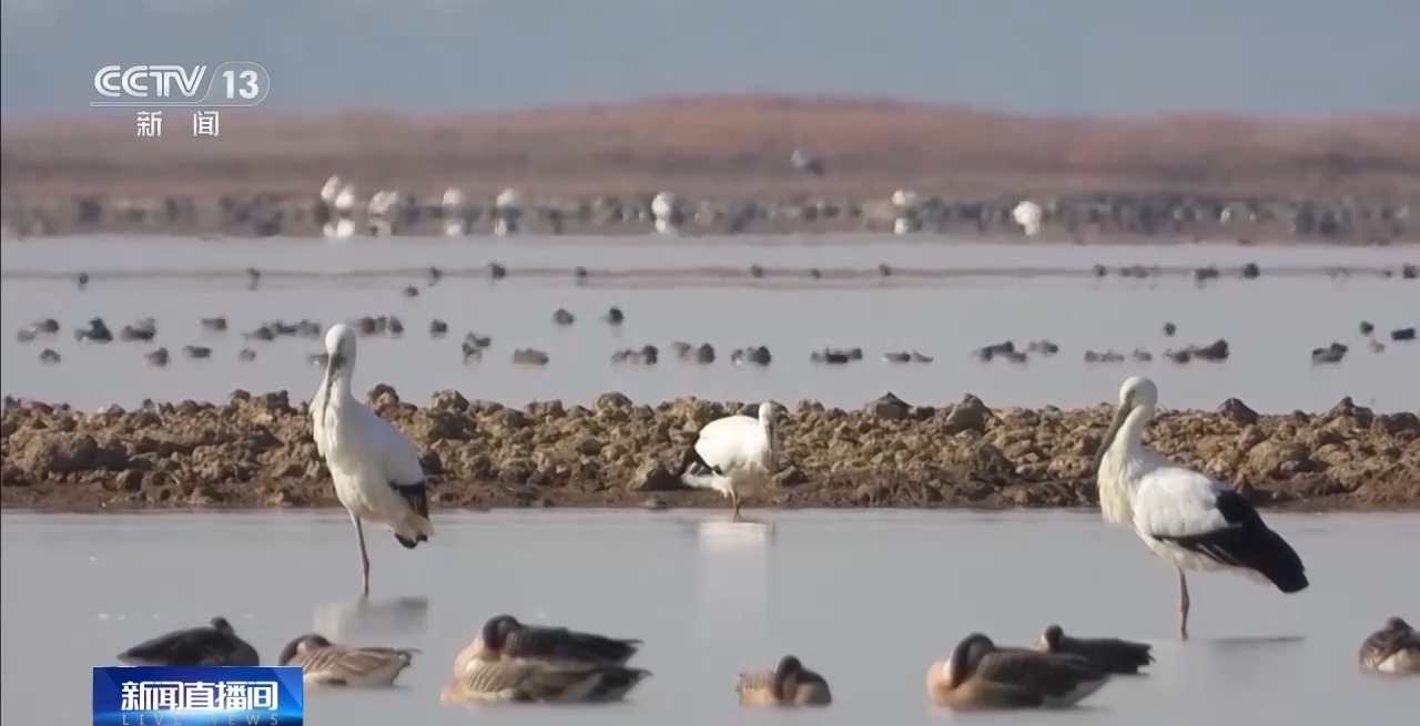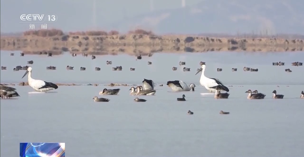白鹤、白枕鹤、东方白鹳、小天鹅、鸿雁等珍稀候鸟聚集在湖面上,在水天之间形成一道独特的生态风景。