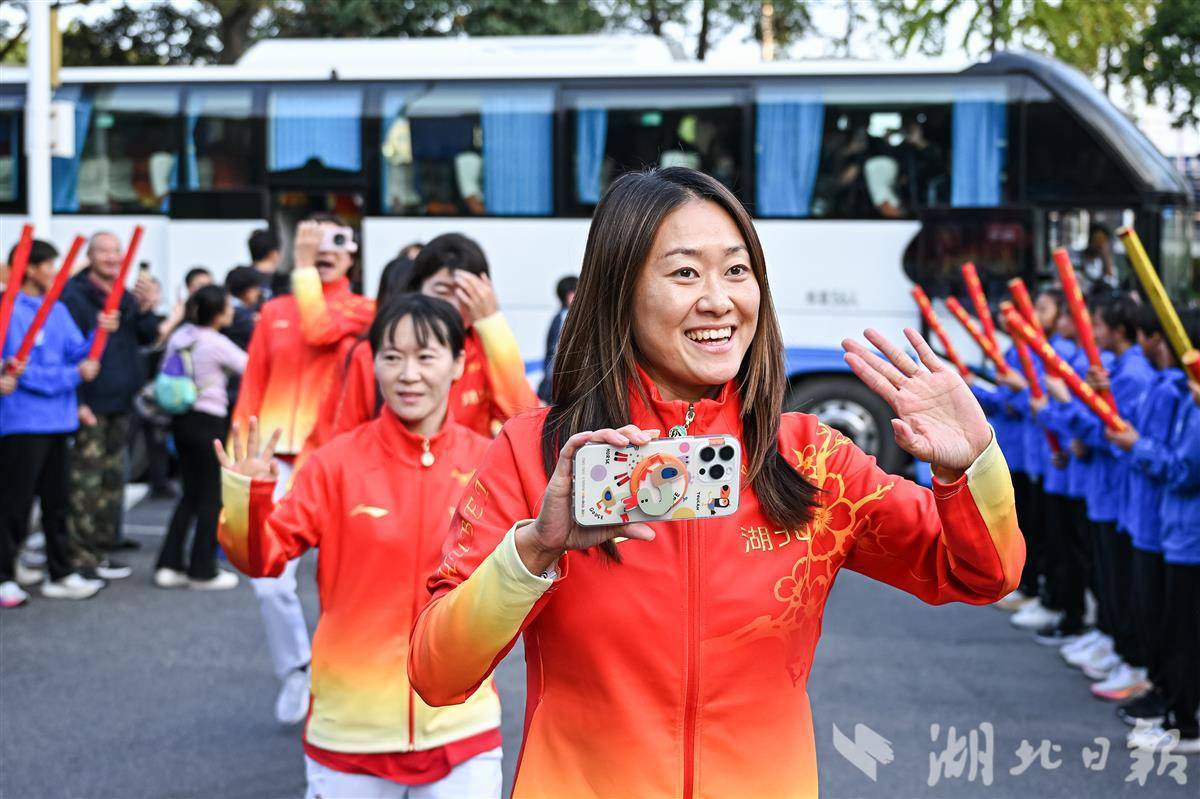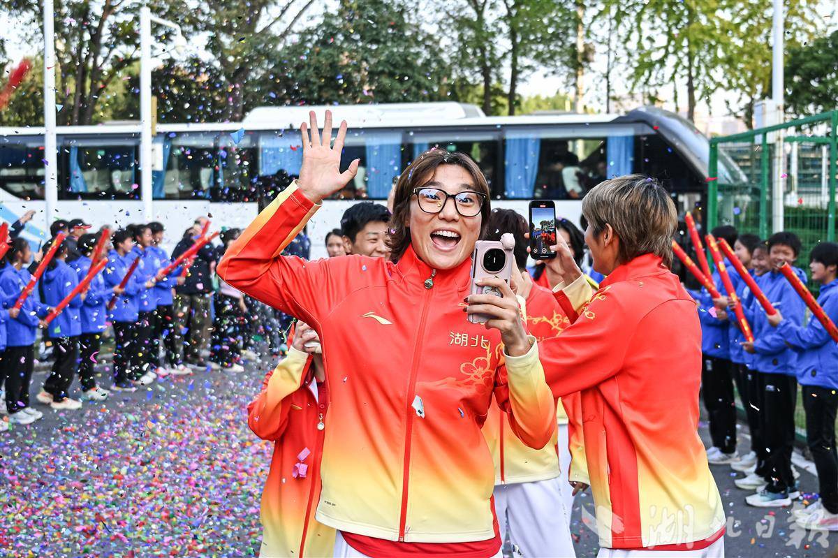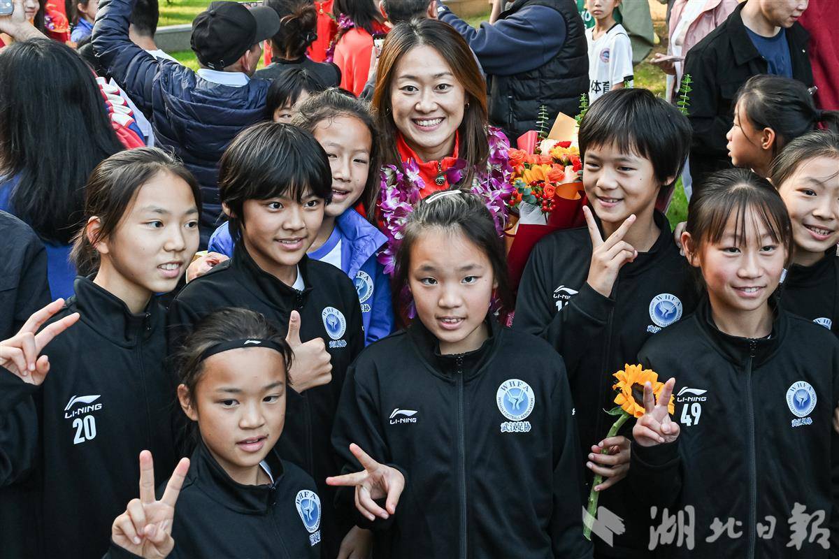 11月16日,湖北女足队员吴海燕向夹道欢迎的小球员们打招呼。(湖北日报全媒记者 任勇 摄)